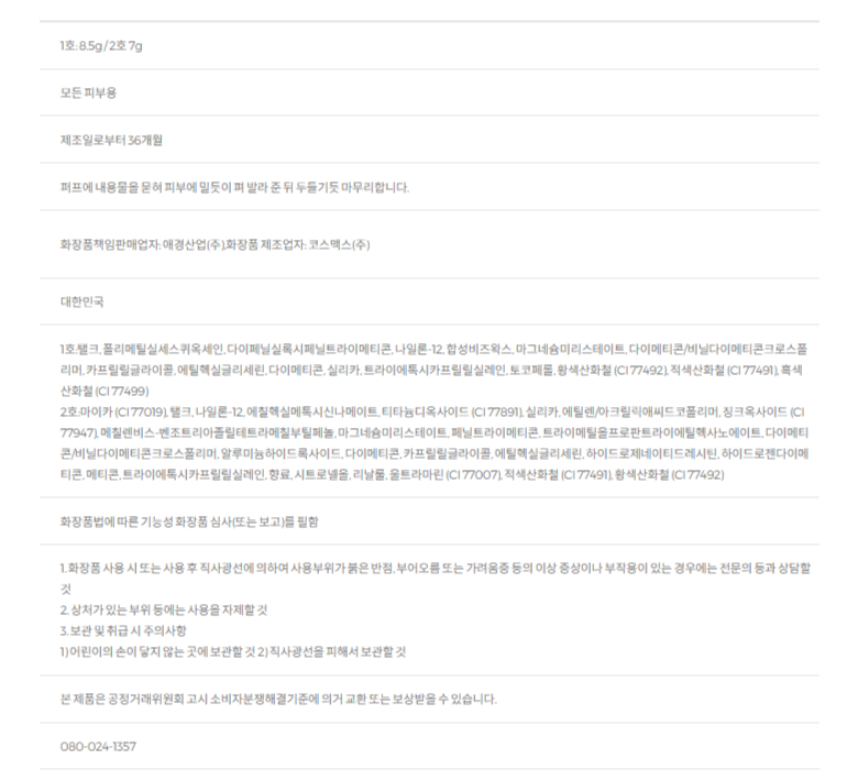 | 화장품제조업자, 화장품책임판매업자 및 맞춤형화장품판매업자 | 상품 상세페이지 참조 | 제조국 | 상품 상세페이지 참조 |