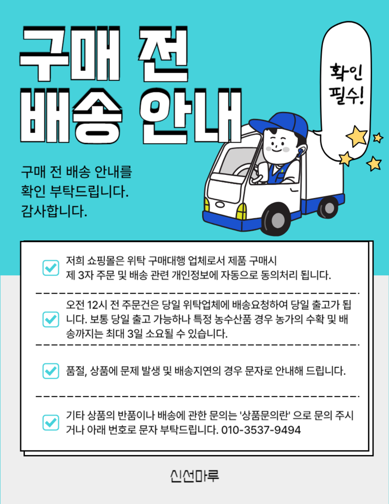 | 배송방법 | 신선/냉장/냉동 | 배송비 | 3,000원 - 119,000원 이상 구매 시 무료배송 - 도서산간 지역 배송불가 |