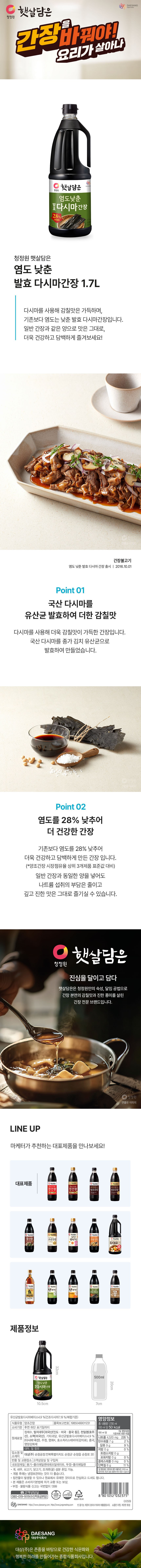 | 제품명 | 청정원 햇살담은 염도낮춘 발효다시마 간장 | 식품의 유형 | 컨텐츠 참조 |