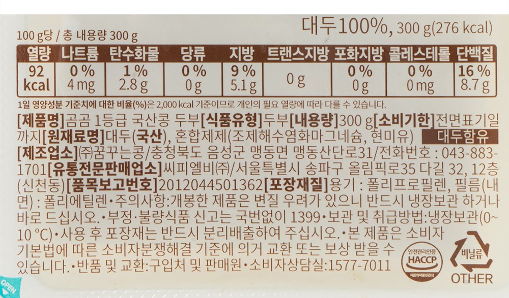 | 제품명 | 곰곰 1등급 국산콩 두부 | 식품의 유형 | 컨텐츠 참조 |