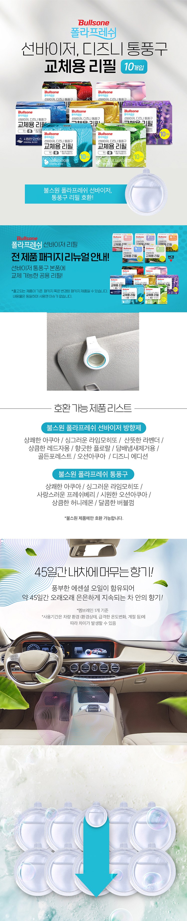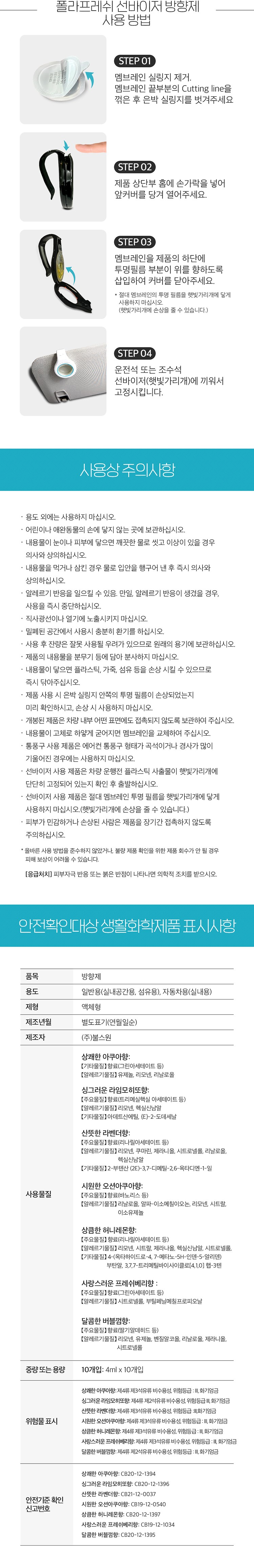 | 품목 및 제품명 | 방향제 / 폴라프레쉬 선바이저 디즈니통풍구 교체용리필 상쾌한 아쿠아향 | 용도(표백제의 경우 계열을 함께표시) 및 제형 | 자동차용-실내용,일반용-실내공간용,일반용-섬유용 / 비분사형-액체형 |