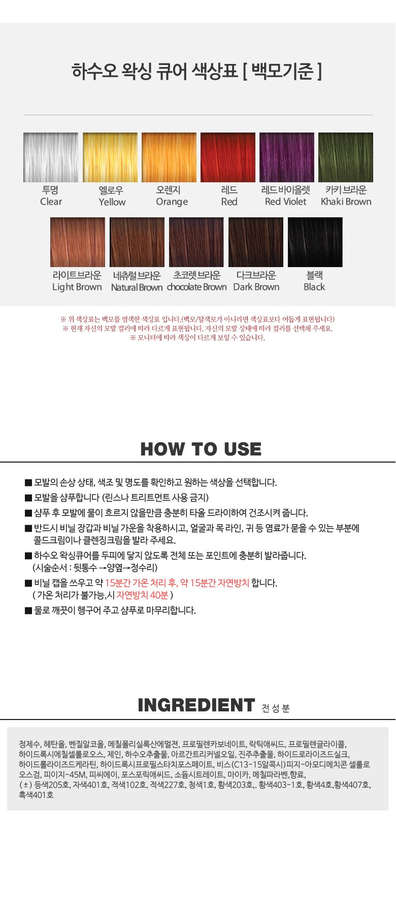 | 사용기한 또는 개봉 후 사용기간 | 제조일부터 3년. 공급사 사정에 따라 제조일자가 다른 상품이 입고되어 정확한 제조년월일 및 사용기한 확인이 어렵습니다. 제조년월일 확인이 어려운 상품은 유통기한을 기준으로 배송되므로 구매 시 유통기한을 참고 부탁드립니다. | 사용방법 | 샴푸 후 모발을 타올드라이 합니다. 훼이스라인 및 네이프라인, 귀 등에 염료가 묻지 않도록 콜드 크림이나 크린싱 크림으로 발라줍니다. 쉬에뜨 먹물 왁싱 트리트먼트 컬러를 두피에 묻지 않도록 주의하여 모근의 뿌리까지 꼼꼼하게 발라줍니다. 비닐캡을 씌우고 약 15분 가온처리 후 약 15분 자연방치합니다. 방치한 뒤 샴푸하고 마무리합니다. |