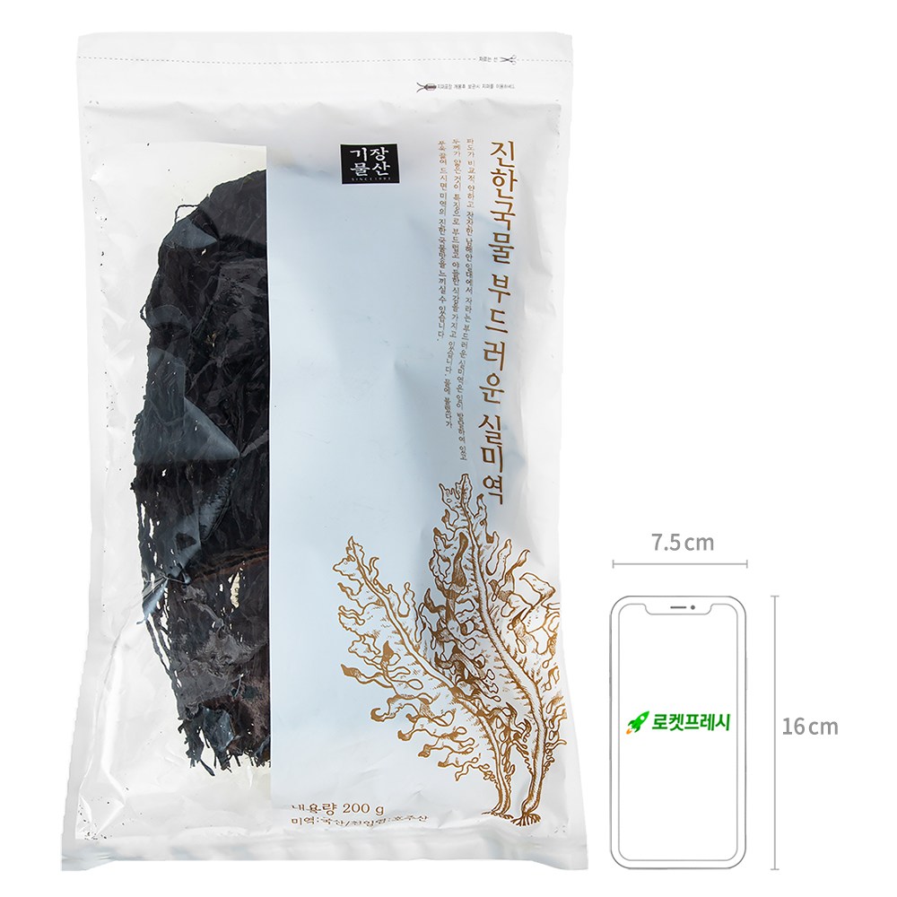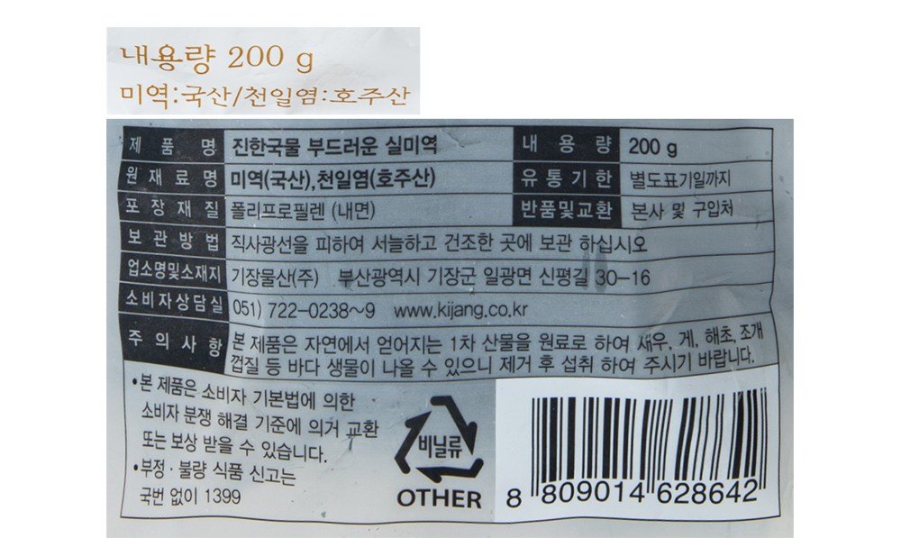 | 품목 또는 명칭 | 진한국물 부드러운 실미역 | 포장단위별 내용물의 용량(중량),수량,크기 | 200g x 2개,1개 |