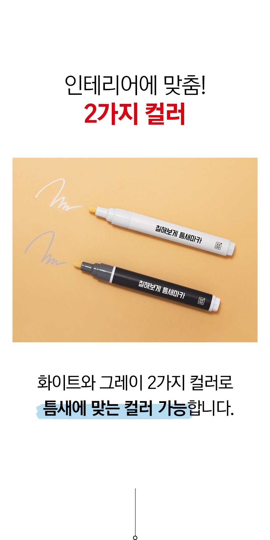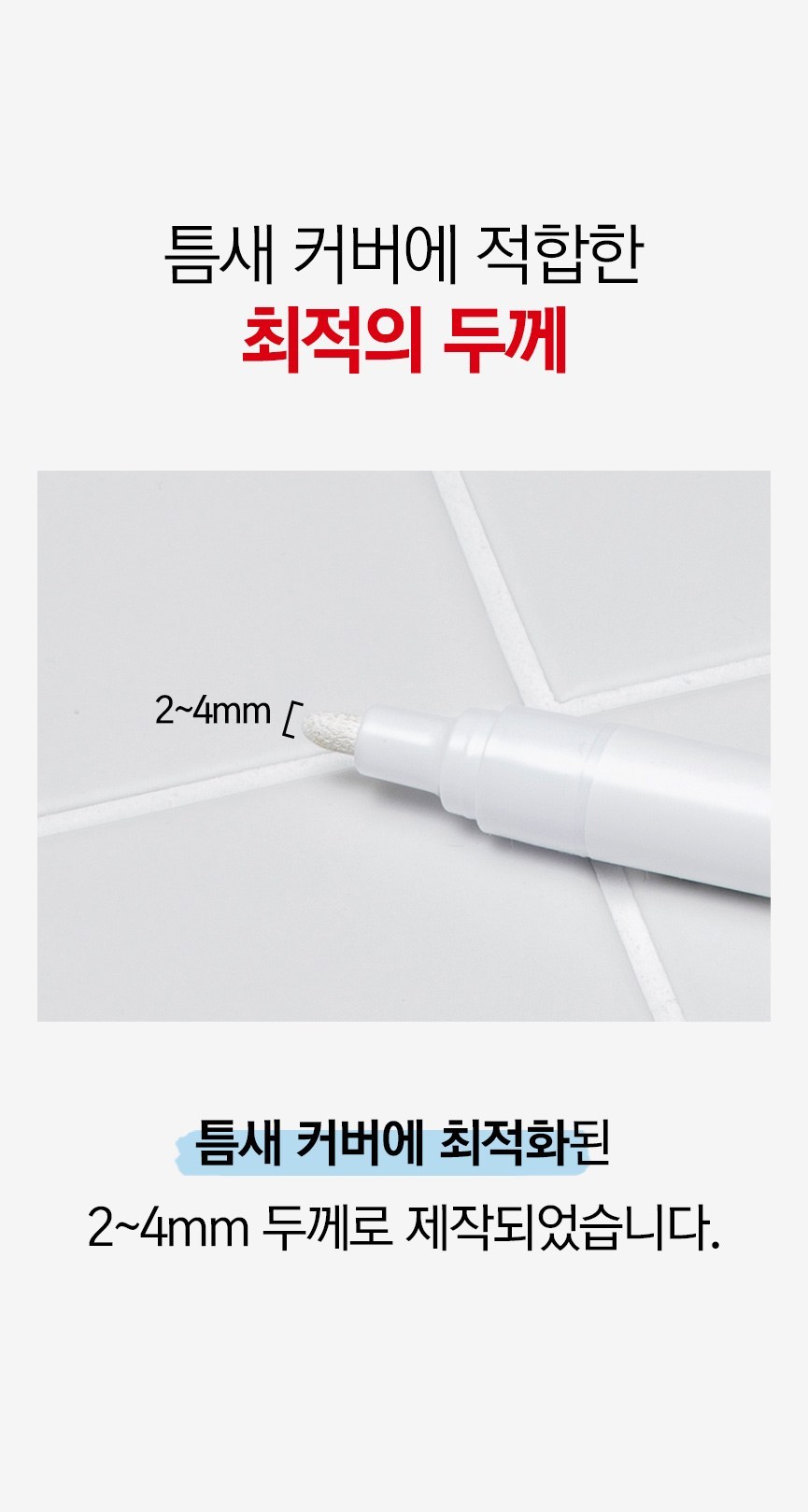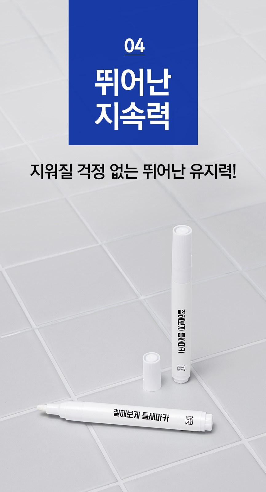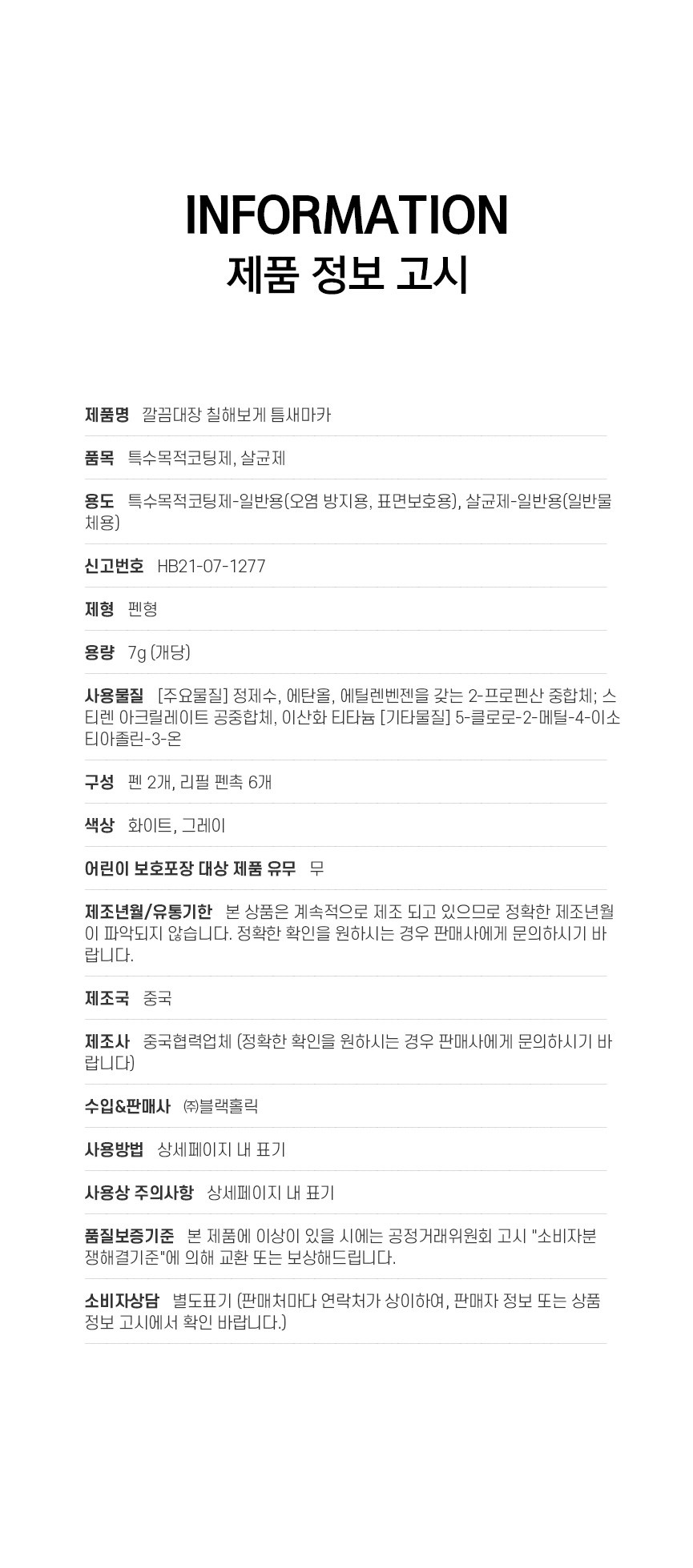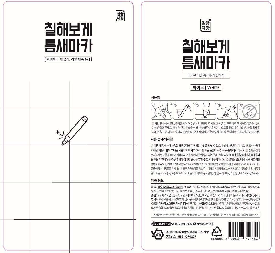 | 품목 및 제품명 | 리뉴얼 전: 특수목적코팅제,살균제 l 리뉴얼 후: 특수목적코팅제/칠해보게 틈새마카 화이트 | 용도(표백제의 경우 계열을 함께표시) 및 제형 | 리뉴얼 전: 특수목적코팅제-일반용(오염방지용, 일반용 (표면보호용)표면보호용), 살균제-일반용(일반물체용) l 리뉴얼 후: 특수목적코팅제-일반용 (오염 방지용), / 펜형 |
