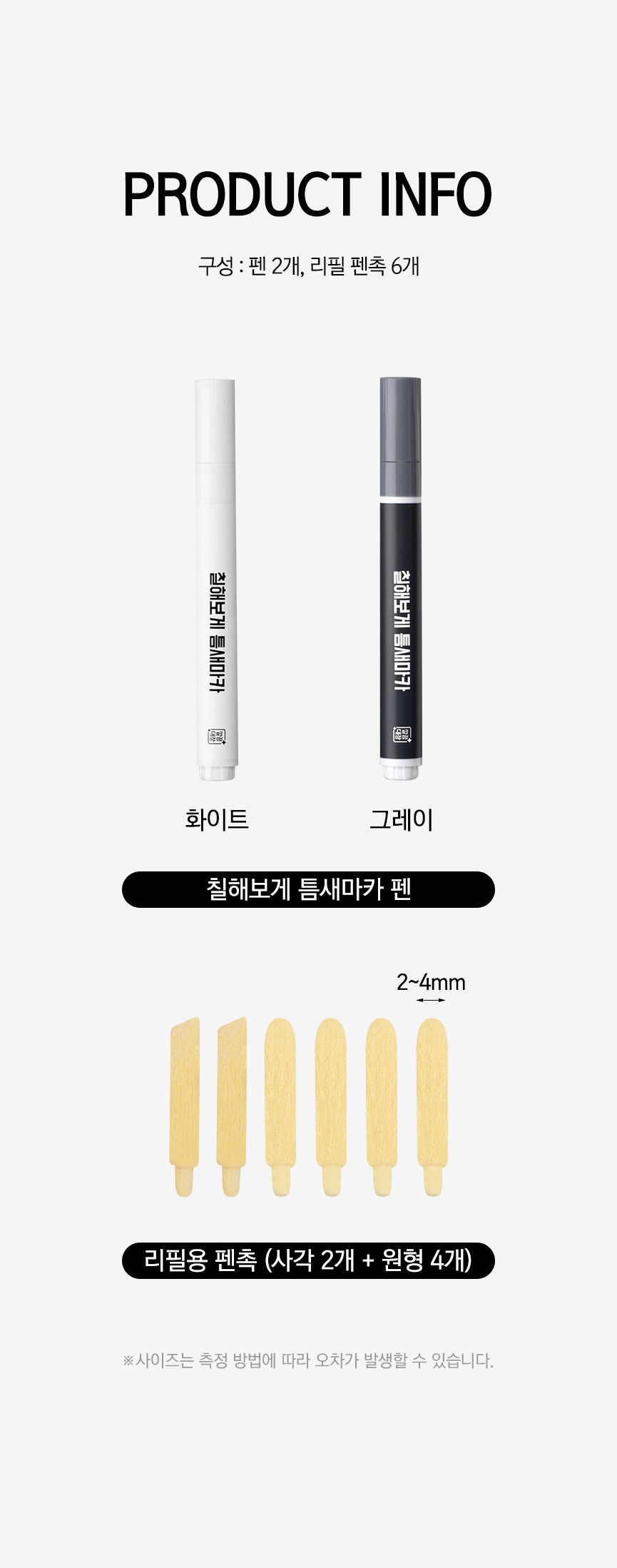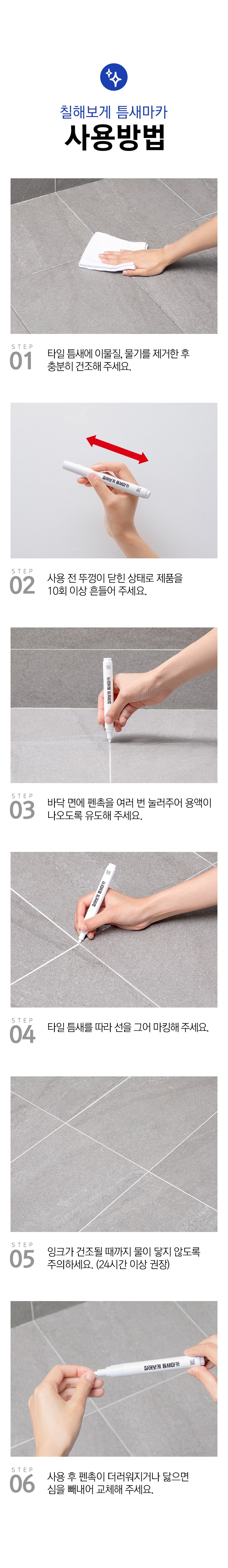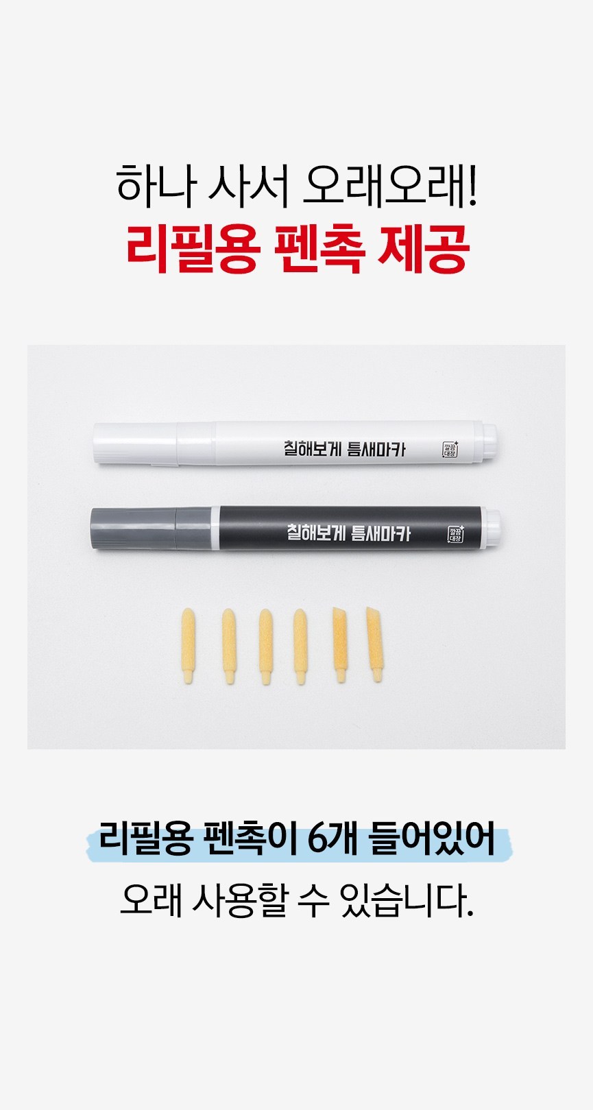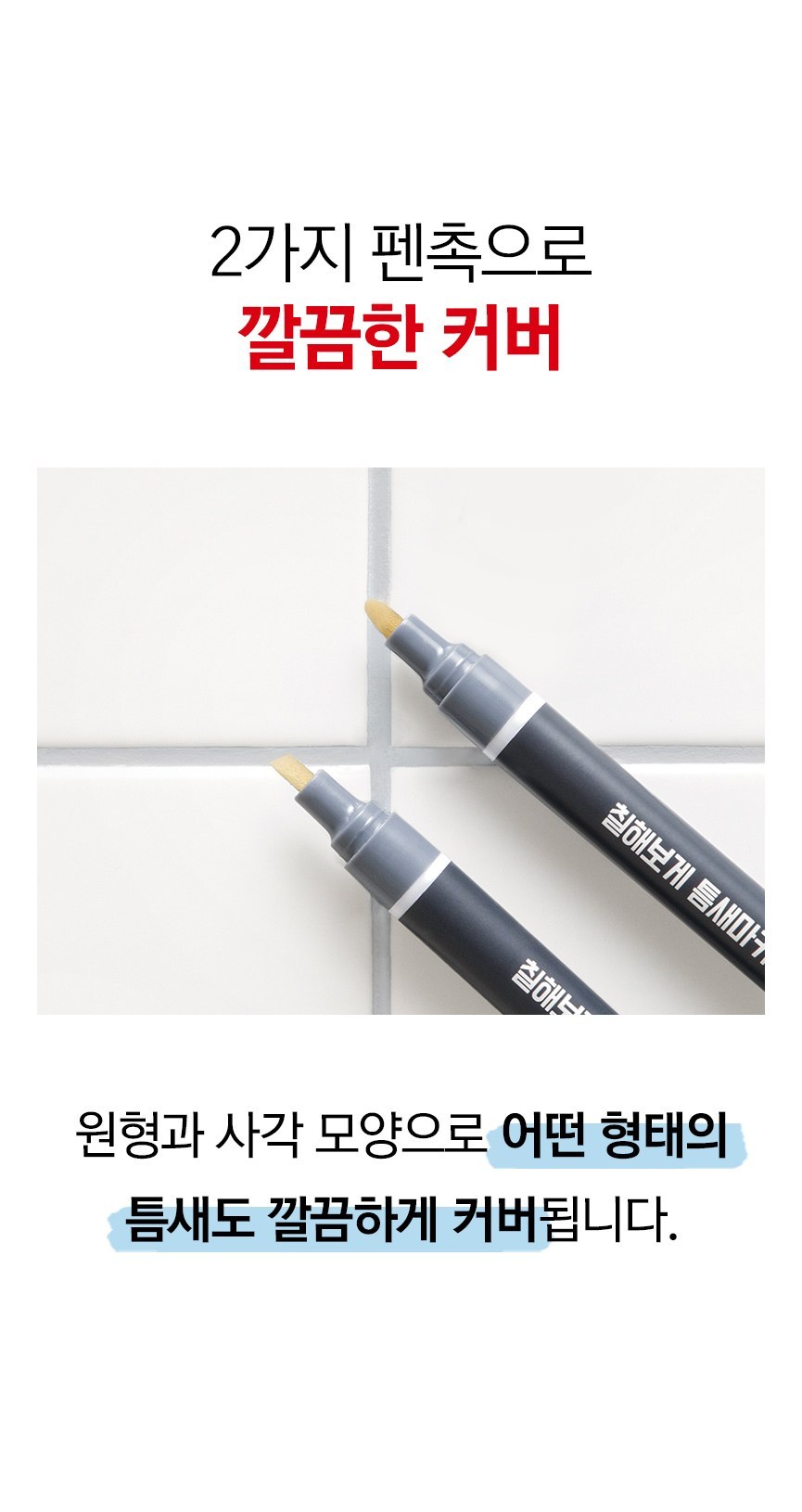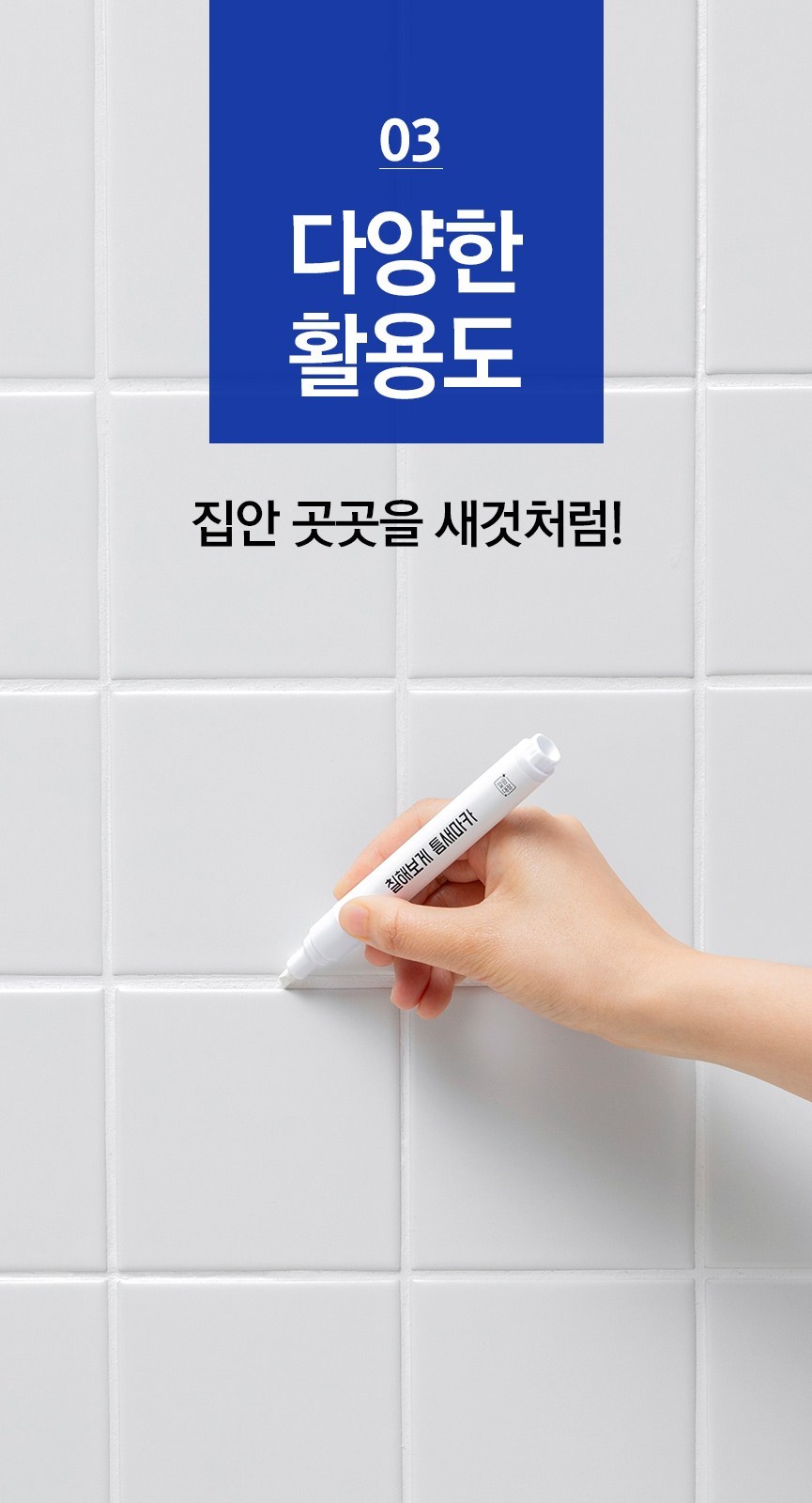 | 품목 및 제품명 | 리뉴얼 전: 특수목적코팅제,살균제 l 리뉴얼 후: 특수목적코팅제/칠해보게 틈새마카 화이트 | 용도(표백제의 경우 계열을 함께표시) 및 제형 | 리뉴얼 전: 특수목적코팅제-일반용(오염방지용, 일반용 (표면보호용)표면보호용), 살균제-일반용(일반물체용) l 리뉴얼 후: 특수목적코팅제-일반용 (오염 방지용), / 펜형 |