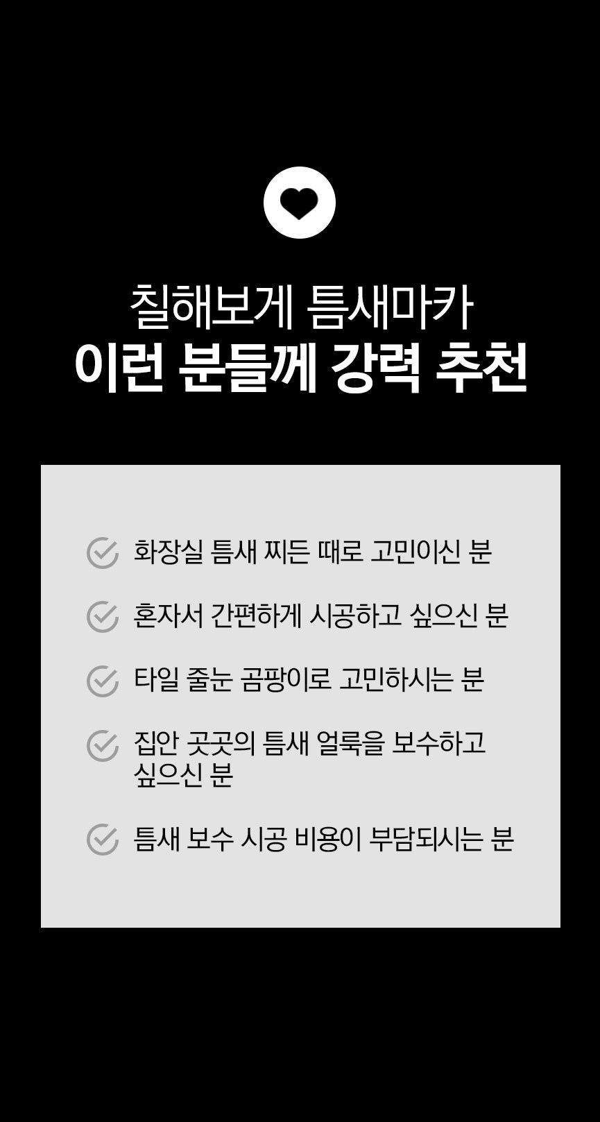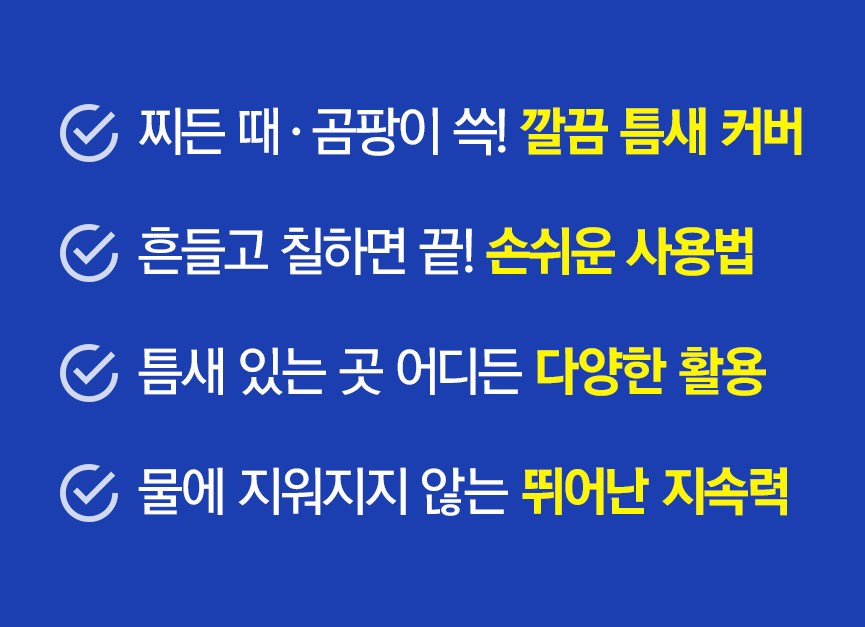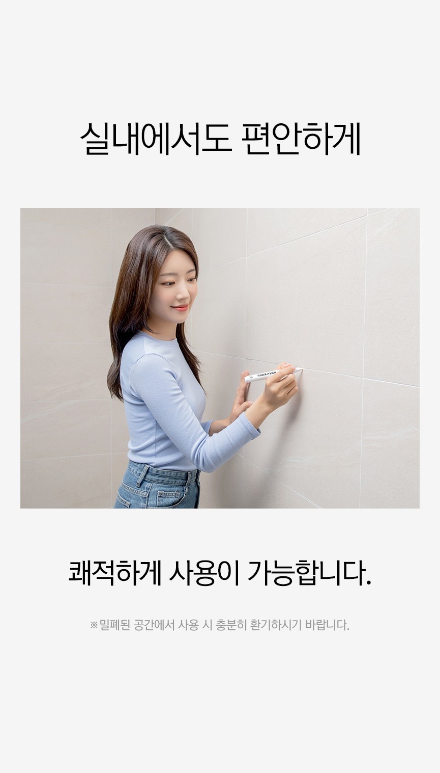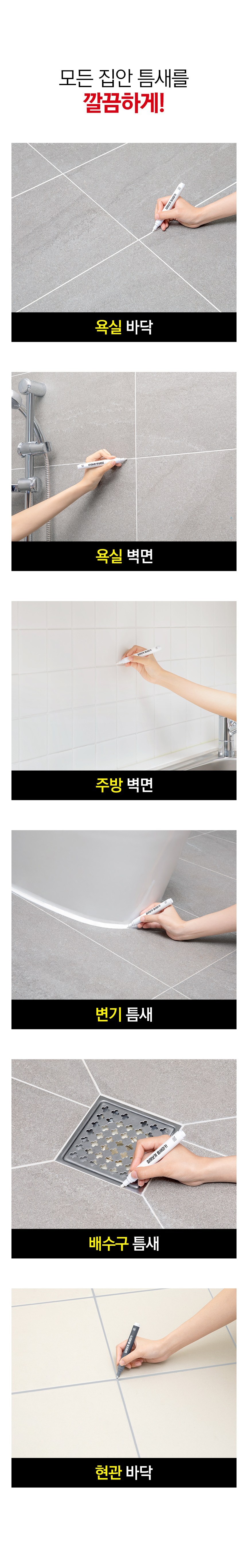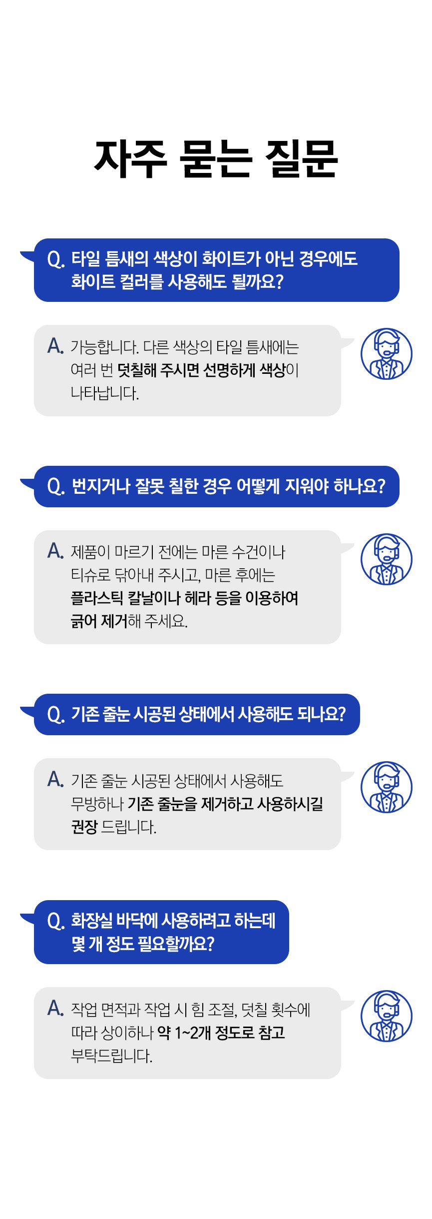 | 품목 및 제품명 | 리뉴얼 전: 특수목적코팅제,살균제 l 리뉴얼 후: 특수목적코팅제/칠해보게 틈새마카 화이트 | 용도(표백제의 경우 계열을 함께표시) 및 제형 | 리뉴얼 전: 특수목적코팅제-일반용(오염방지용, 일반용 (표면보호용)표면보호용), 살균제-일반용(일반물체용) l 리뉴얼 후: 특수목적코팅제-일반용 (오염 방지용), / 펜형 |