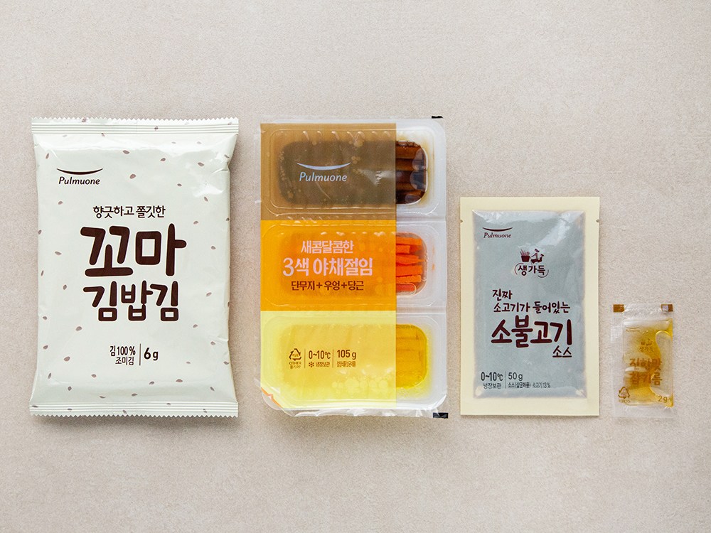 꼬마 김밥 김, 3색 야채절임(우엉, 당근, 단무지), 소불고기 소스, 참기름으로 구성되어 있습니다.