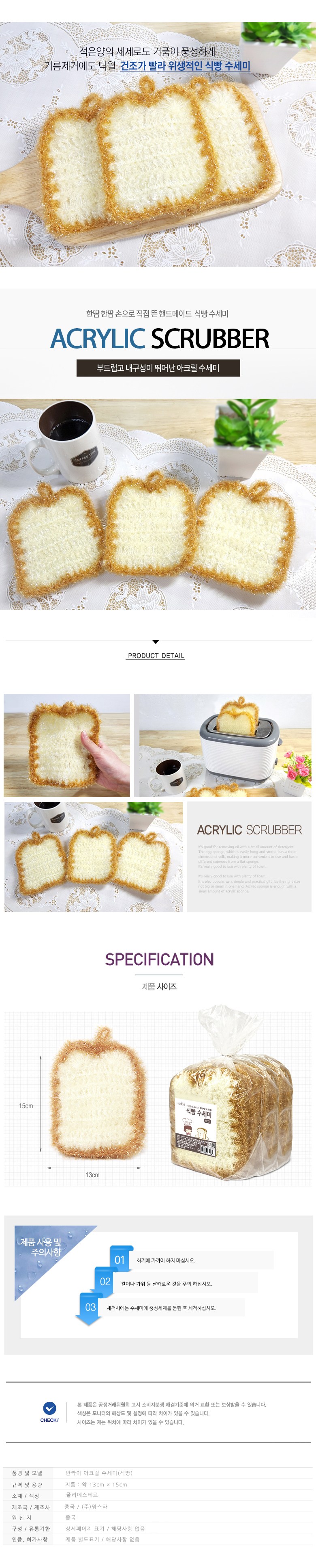| 품명 및 모델명 | 나무이야기 반짝이 아크릴 수세미 식빵 | 재질 | 컨텐츠 참조 |
