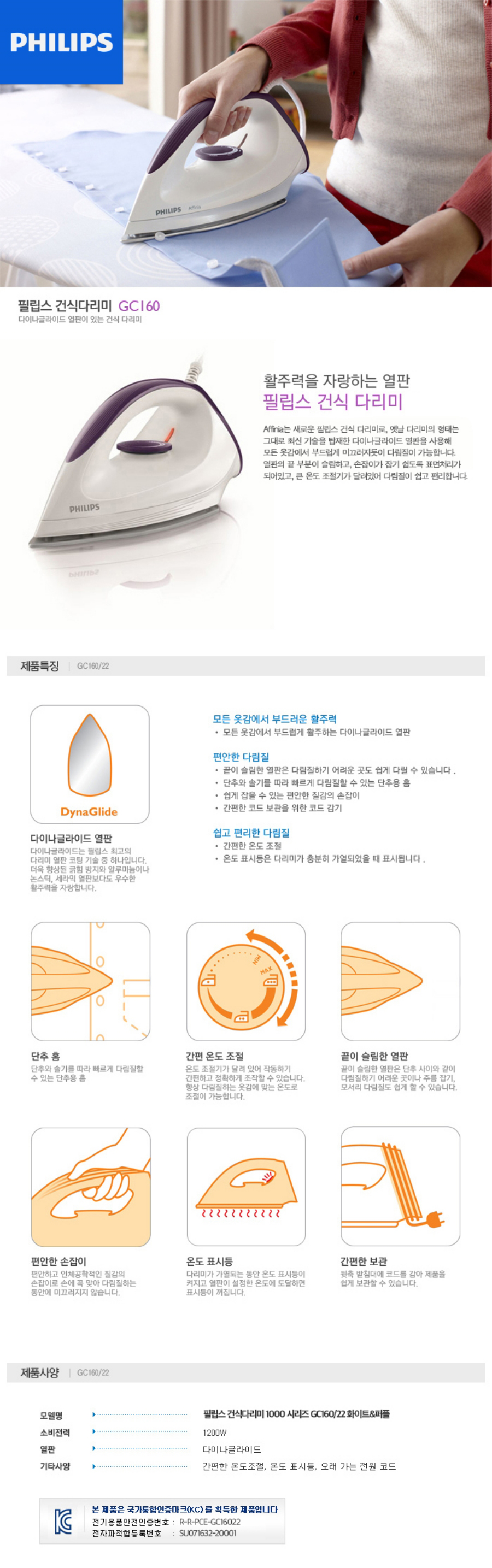 | 품명 및 모델명 | [필립스]건식 다리미 GC160/22 | KC 인증정보 | SU071632-20001, R-R-PCE-GC16022 |