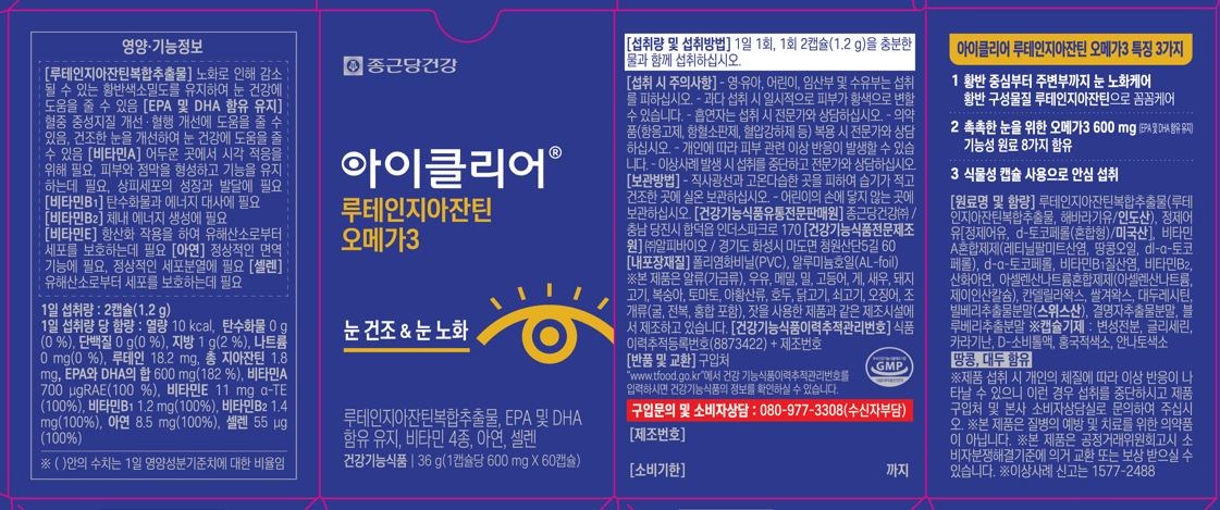 | 제품명 | 아이클리어 루테인지아잔틴 오메가3 | 제조업소의 명칭과 소재지 | 컨텐츠 참조 |