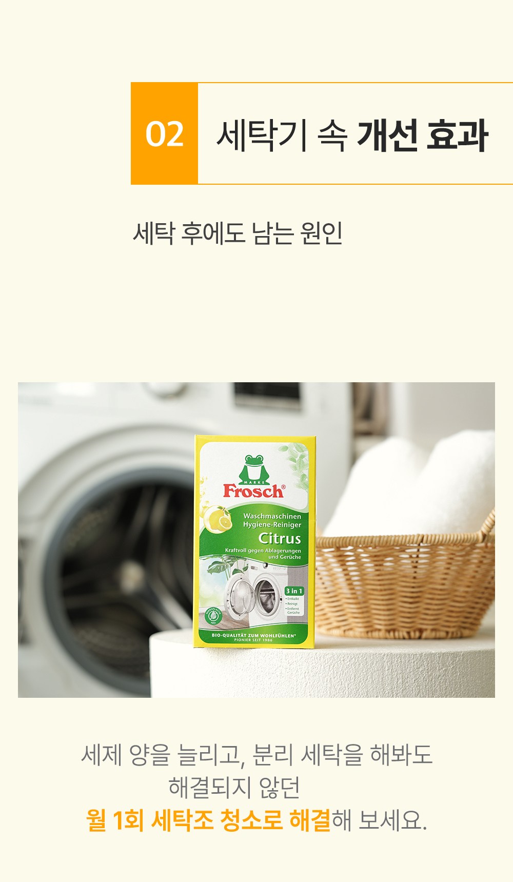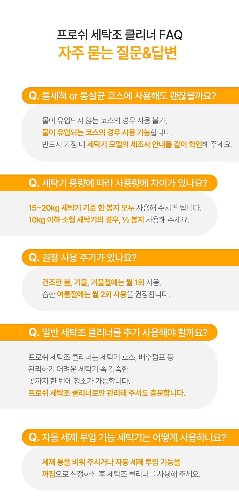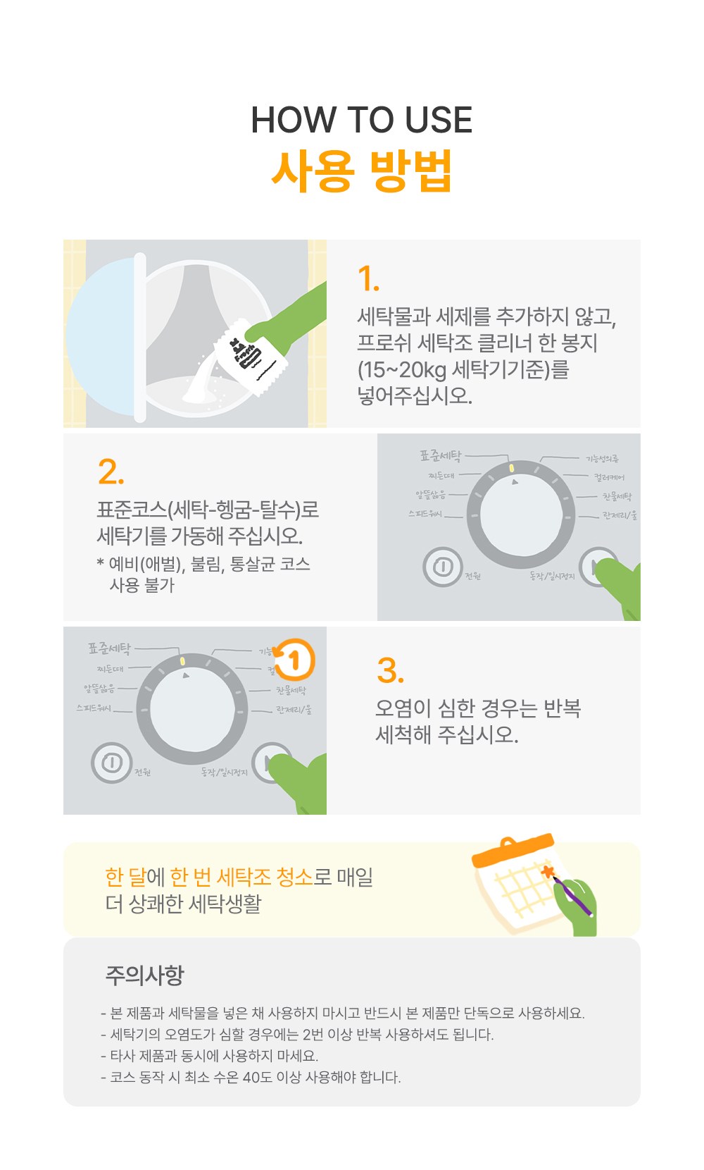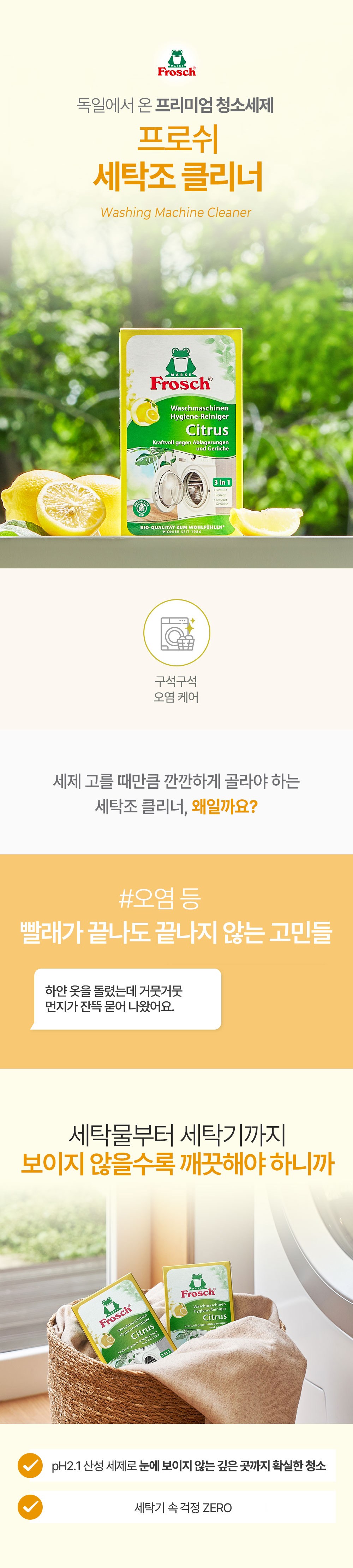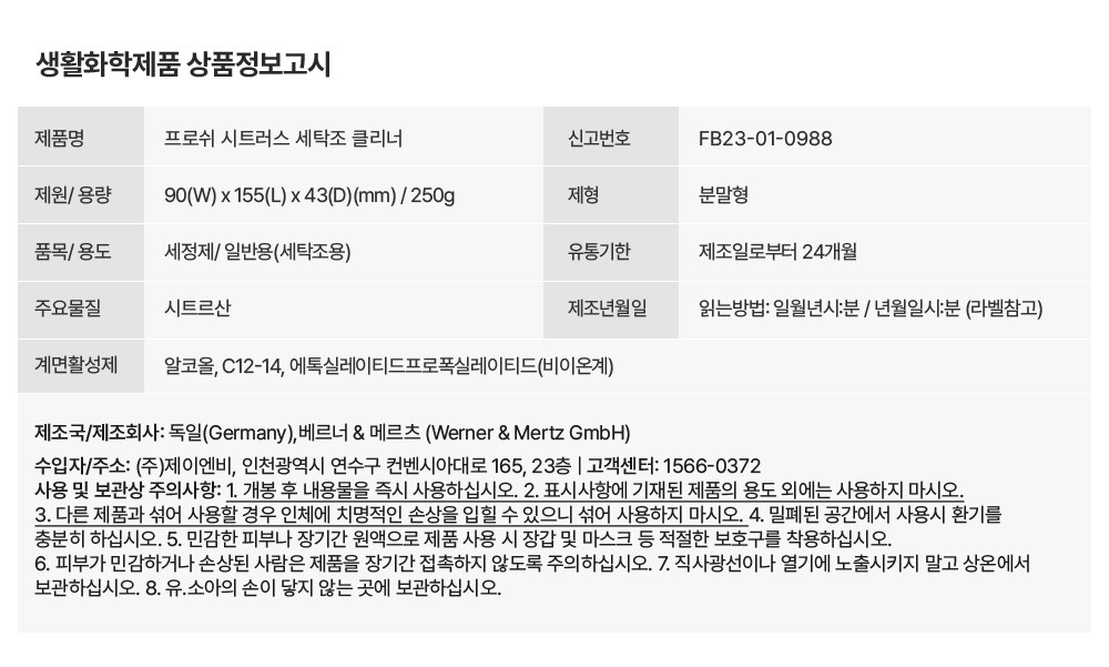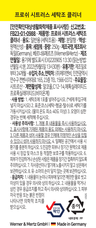 | 품목 및 제품명 | 세정제 / 프로쉬 시트러스 세탁조 클리너 | 용도(표백제의 경우 계열을 함께표시) 및 제형 | 일반용(세탁조용) / 분말형 |