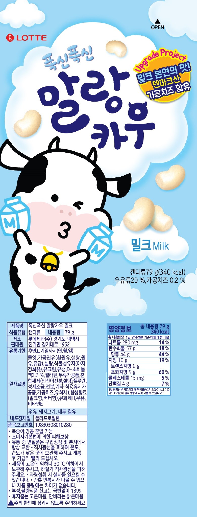 | 제품명 | 롯데제과 폭신폭신 말랑카우 밀크 | 식품의 유형 | 캔디류 |