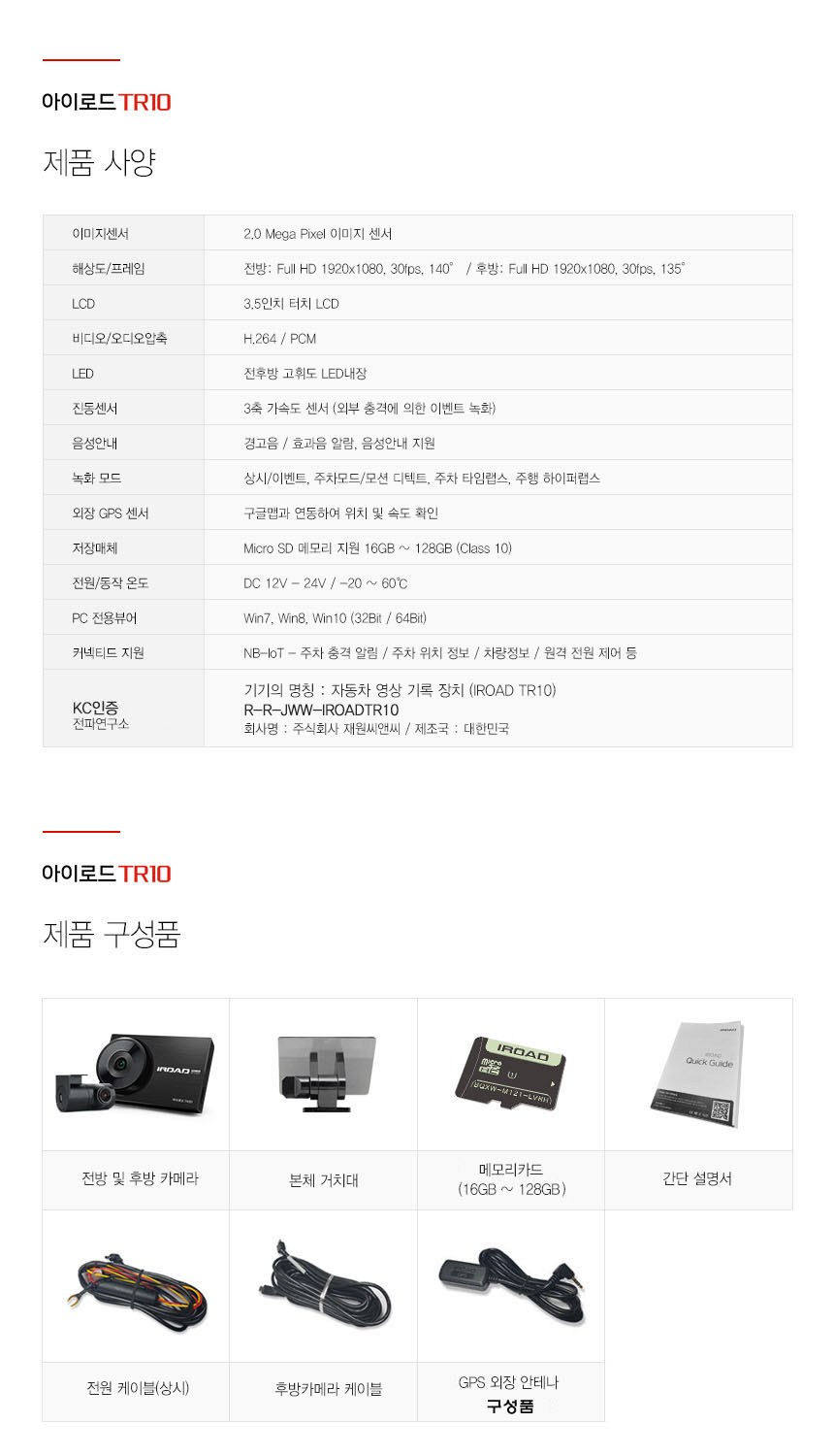 | KC 인증정보(자동차관리법에 따른 자기인증 대상 자동차부품에 한함) | R-R-JWW-IROADTR10 | 제조자(수입자) | 주식회사 재원씨앤씨 |