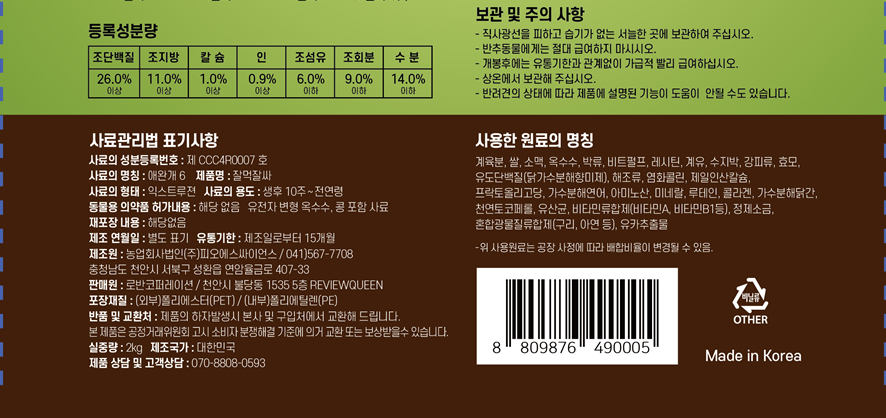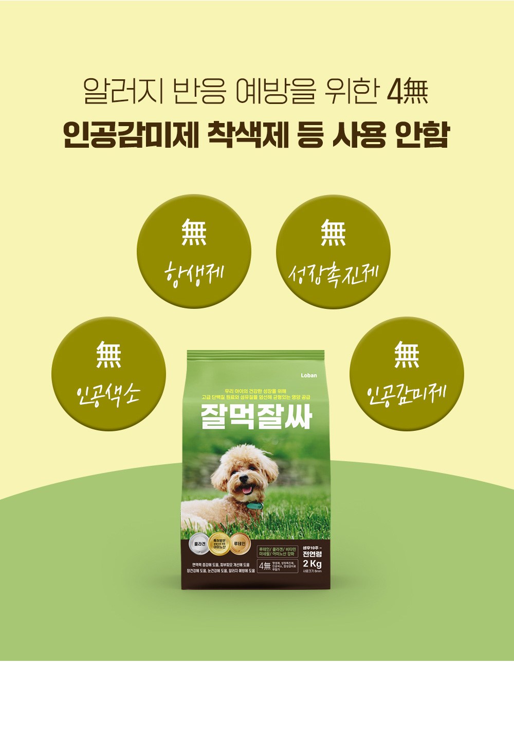 | 품명 및 모델명 | 잘먹잘싸 | 인증/허가 사항 | 사료관리법에 따른 성분등록번호 : 컨텐츠 참조 |