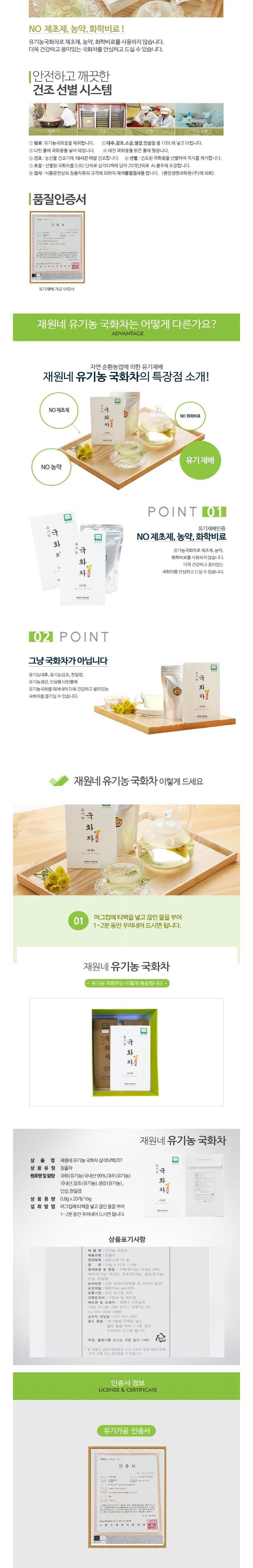 | 원재료명 및 함량 | 국화(유기농)국내산99%대추(유기농)국내산, 감초(유기농)국내산,생강(유기농)국내산,인삼국내산, 천일염국내산, | 영양성분 | 식품위생법에 따른 영양성분 표시대상 식품에 한함해당없음 |