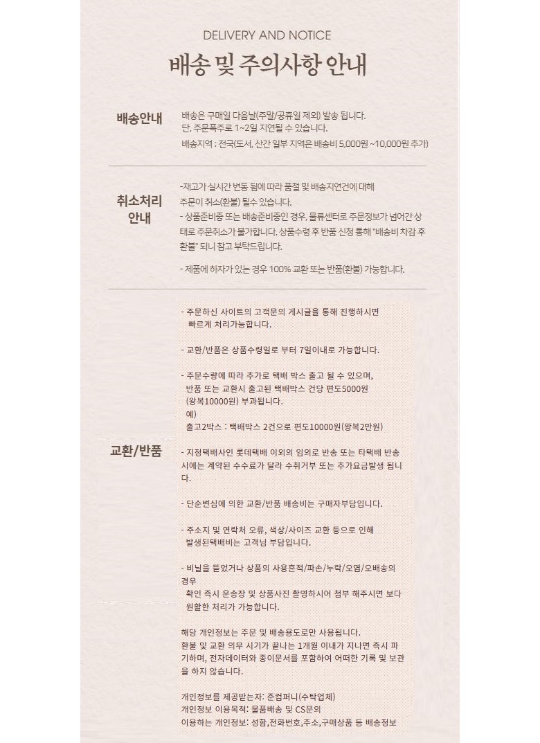 | 교환/반품 비용 (왕복비용) | 10,000원 - 단, 고객 변심의 경우에만 발생 - 도서산간 및 일부 지역 추가비용 발생 |