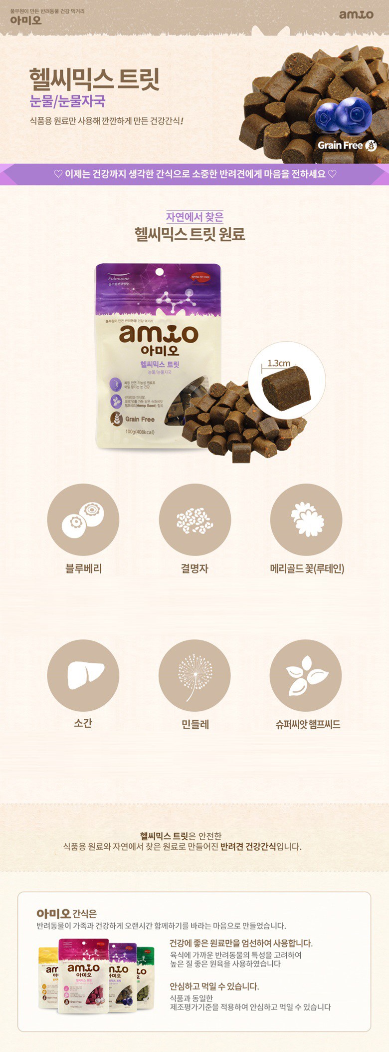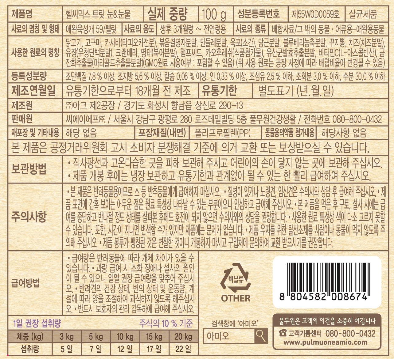 | 품명 및 모델명 | 헬씨믹스 트릿 눈&눈물 | 인증/허가 사항 | 사료관리법에 따른 성분등록번호 : 컨텐츠 참조 |