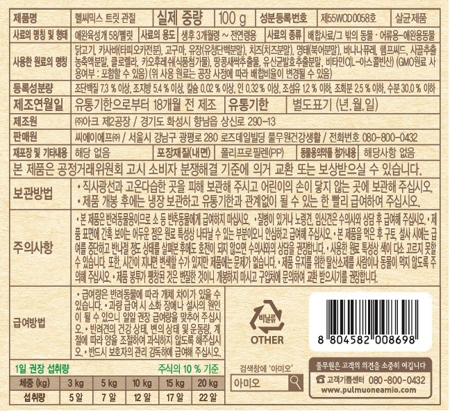 | 품명 및 모델명 | 헬씨믹스 트릿 관절 | 인증/허가 사항 | 사료관리법에 따른 성분등록번호 : 컨텐츠 참조 |