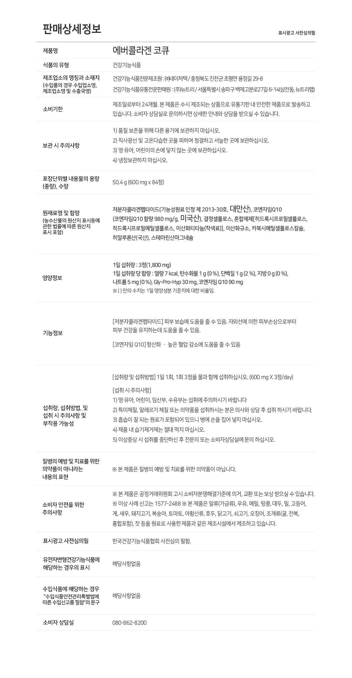 | 원료명 및 함량 | 컨텐츠 참조 | 영양정보 | 컨텐츠 참조 |