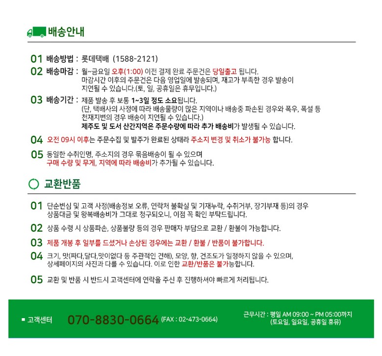 | 배송기간 | ㆍ도서산간 지역 등은 배송에 3-5일이 더 소요될 수 있습니다. - 천재지변, 물량 수급 변동 등 예외적인 사유 발생 시, 다소 지연될 수 있는 점 양해 부탁드립니다. | ||