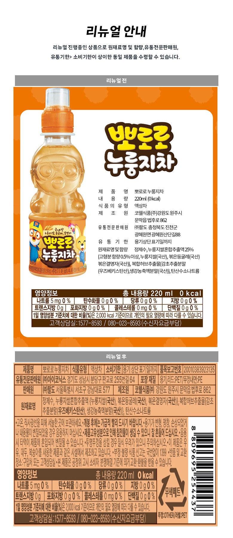 | 제품명 | 뽀로로 누룽지차 | 식품의 유형 | 액상차 |