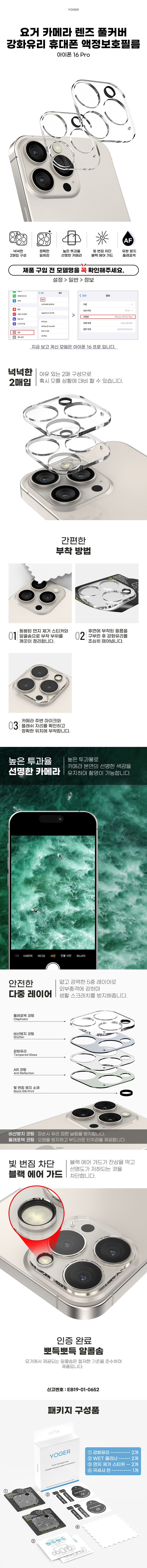 | 품명 및 모델명 | 요거 카메라 렌즈 풀커버 강화유리 휴대폰 액정보호필름 | 인증/허가 사항 | 본품 : 해당없음 | 알콜솜 : EB19-01-0652 |