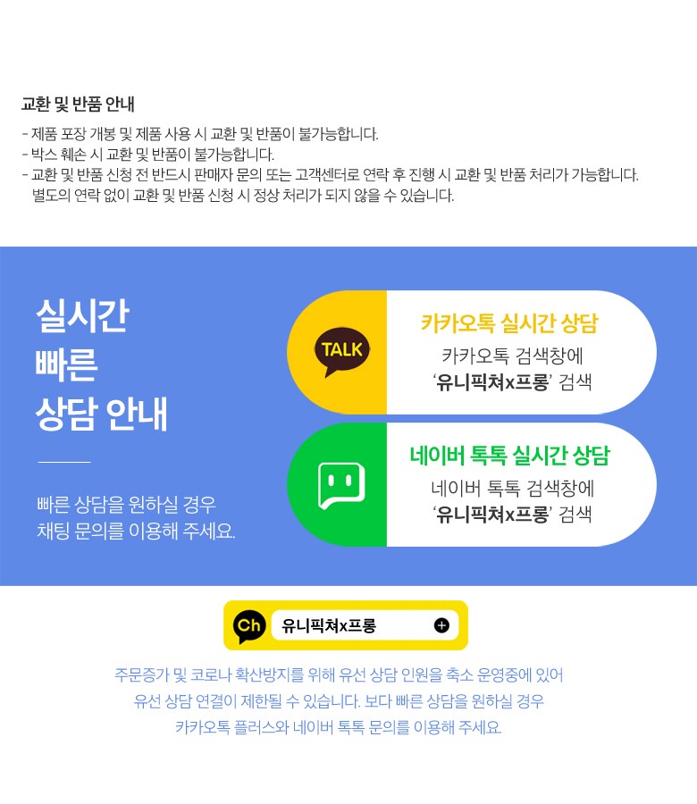 - ㆍ모니터 해상도의 차이로 인해 색상이나 이미지가 실제와 달라, 고객이 단순 변심으로 교환/반품을 무료로 요청하는 경우