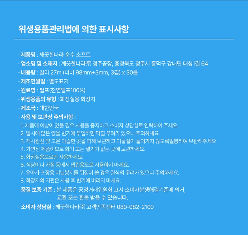 | 제조국(원산지) | 대한민국 | 제조자(수입자) | 깨끗한나라(주)청주공장 |
