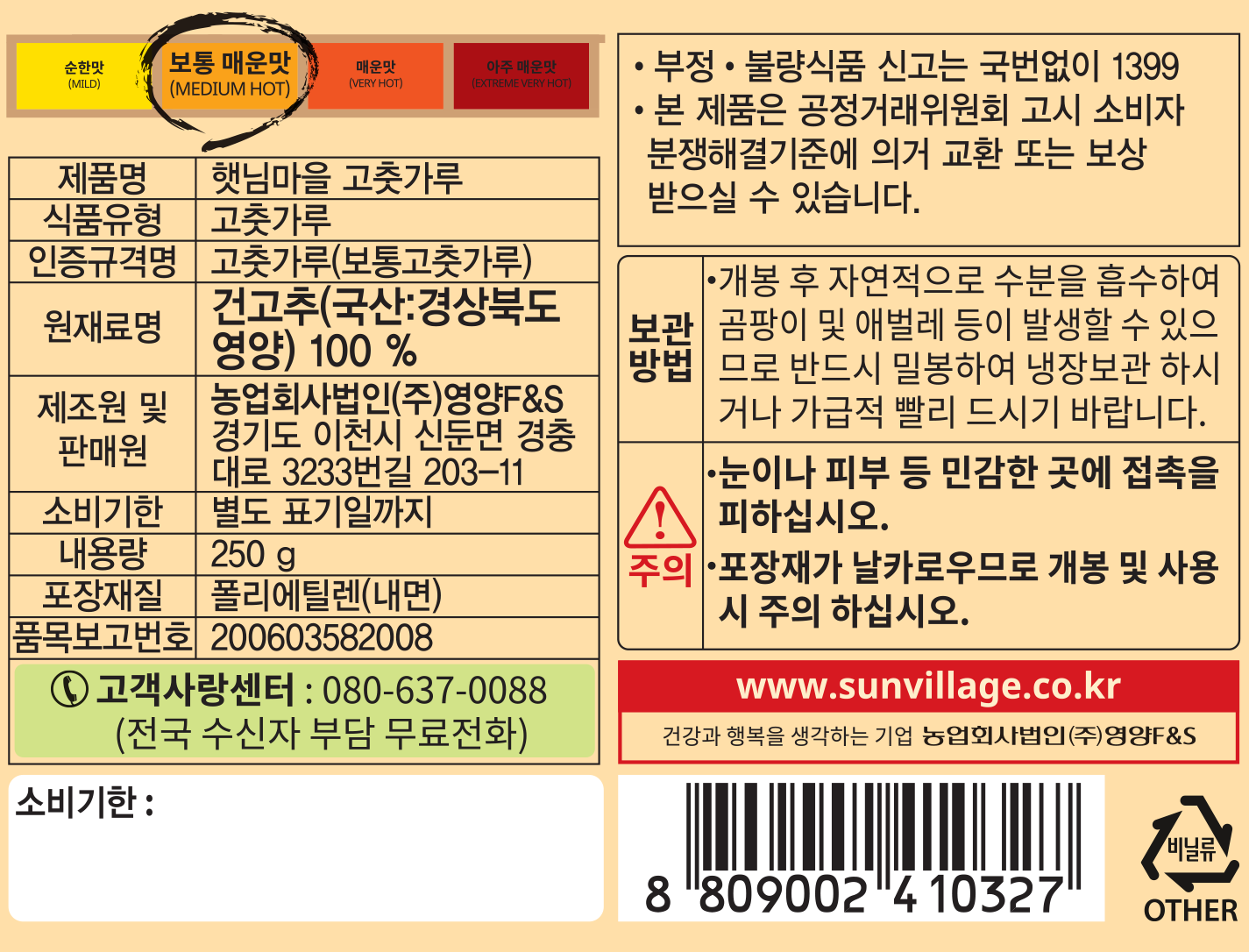 | 제품명 | 햇님마을 고춧가루 | 식품의 유형 | 고춧가루 |