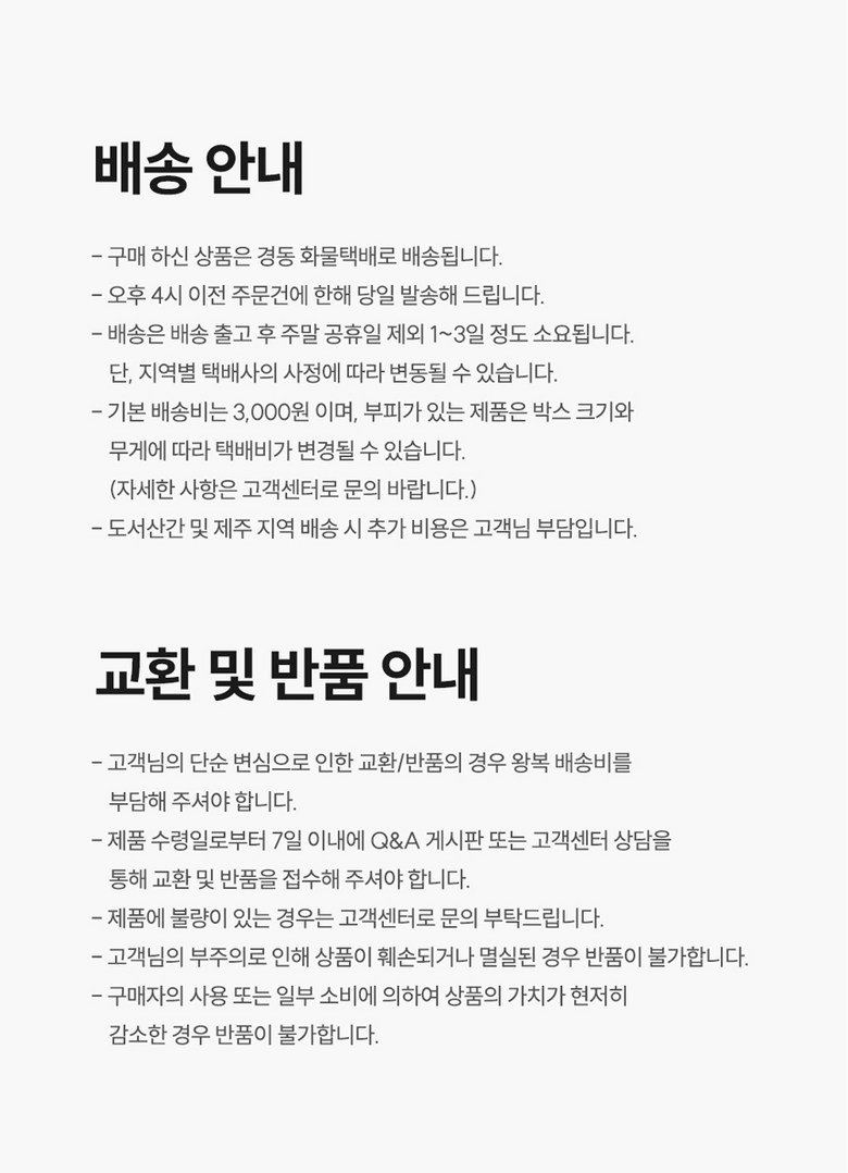 | 배송기간 | ㆍ도서산간 지역 등은 배송에 3-5일이 더 소요될 수 있습니다. - 천재지변, 물량 수급 변동 등 예외적인 사유 발생 시, 다소 지연될 수 있는 점 양해 부탁드립니다. | ||
