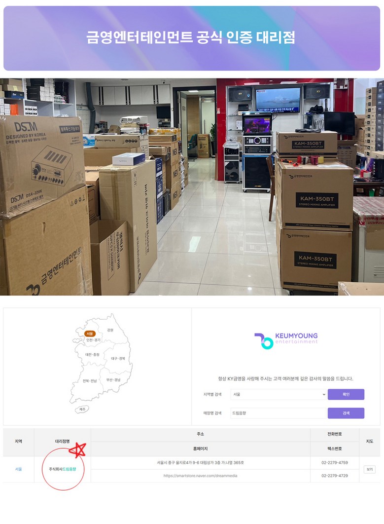 상호/대표자 | 주식회사 드림음향 / 마성권 | 사업장 소재지 | 서울특별시 중구 을지로 157 대림상가 3층 가,나열 365호 (산림동) |