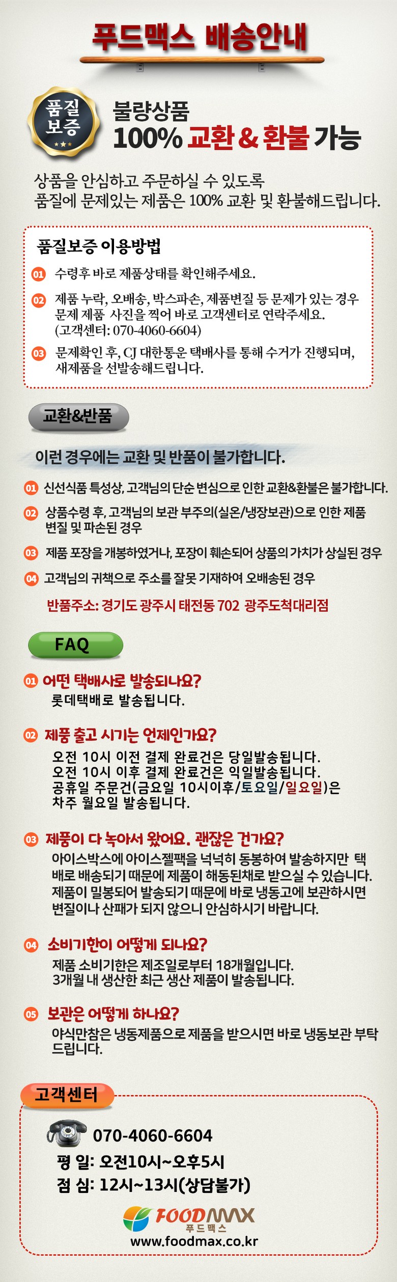 | 배송방법 | 신선/냉장/냉동 | 배송비 | 무료배송 · 도서산간 추가 배송비 - 제주 지역: 3,000원 - 도서산간 지역: 3,000원 |
