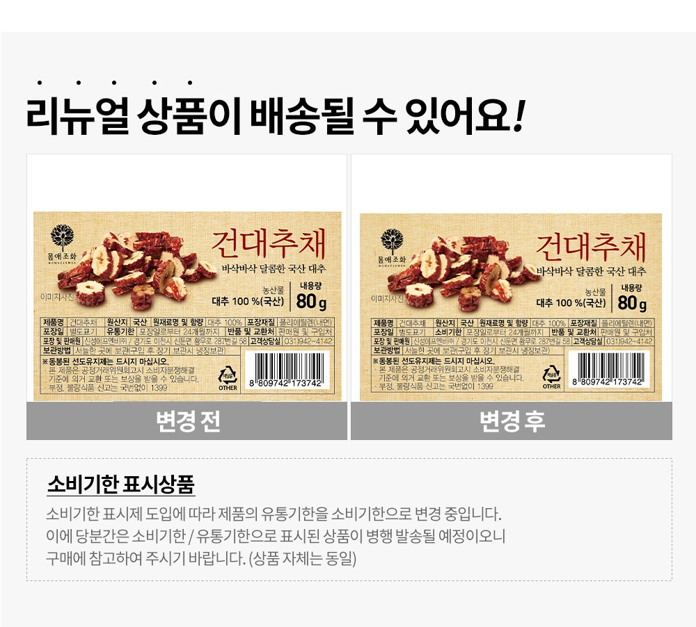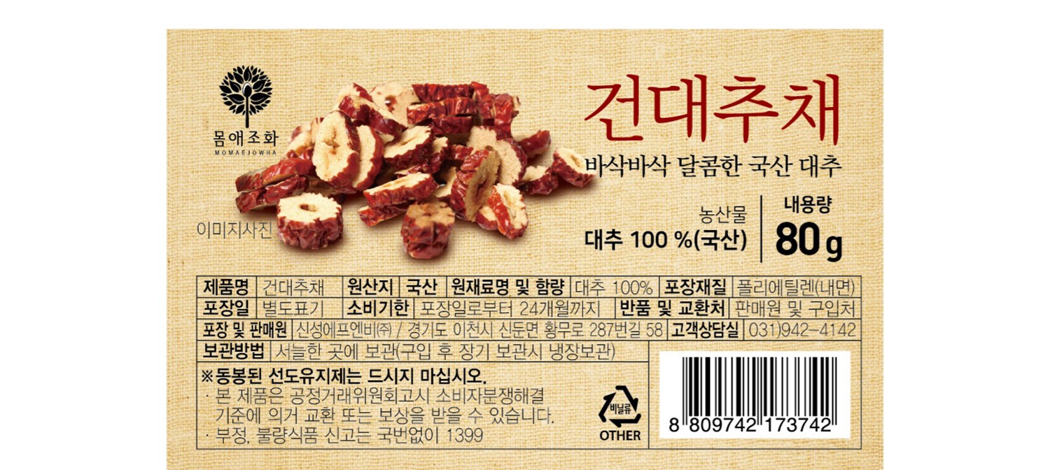 | 품목 또는 명칭 | 건대추채 | 포장단위별 내용물의 용량(중량),수량,크기 | 80g, 1개 |