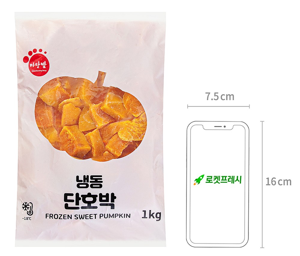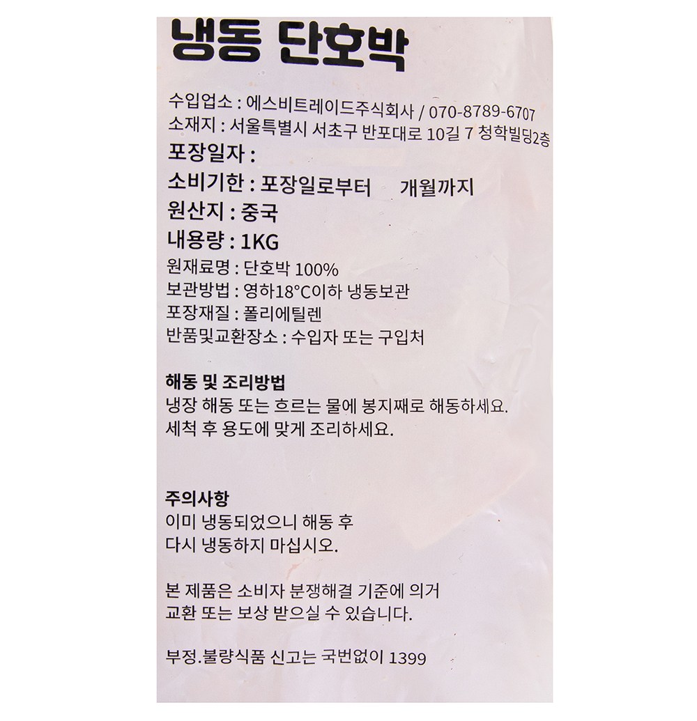 | 품목 또는 명칭 | 냉동 단호박 | 포장단위별 내용물의 용량(중량),수량,크기 | 1kg*2개 |