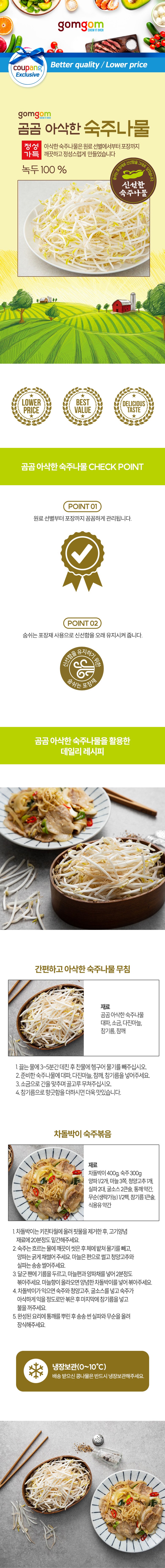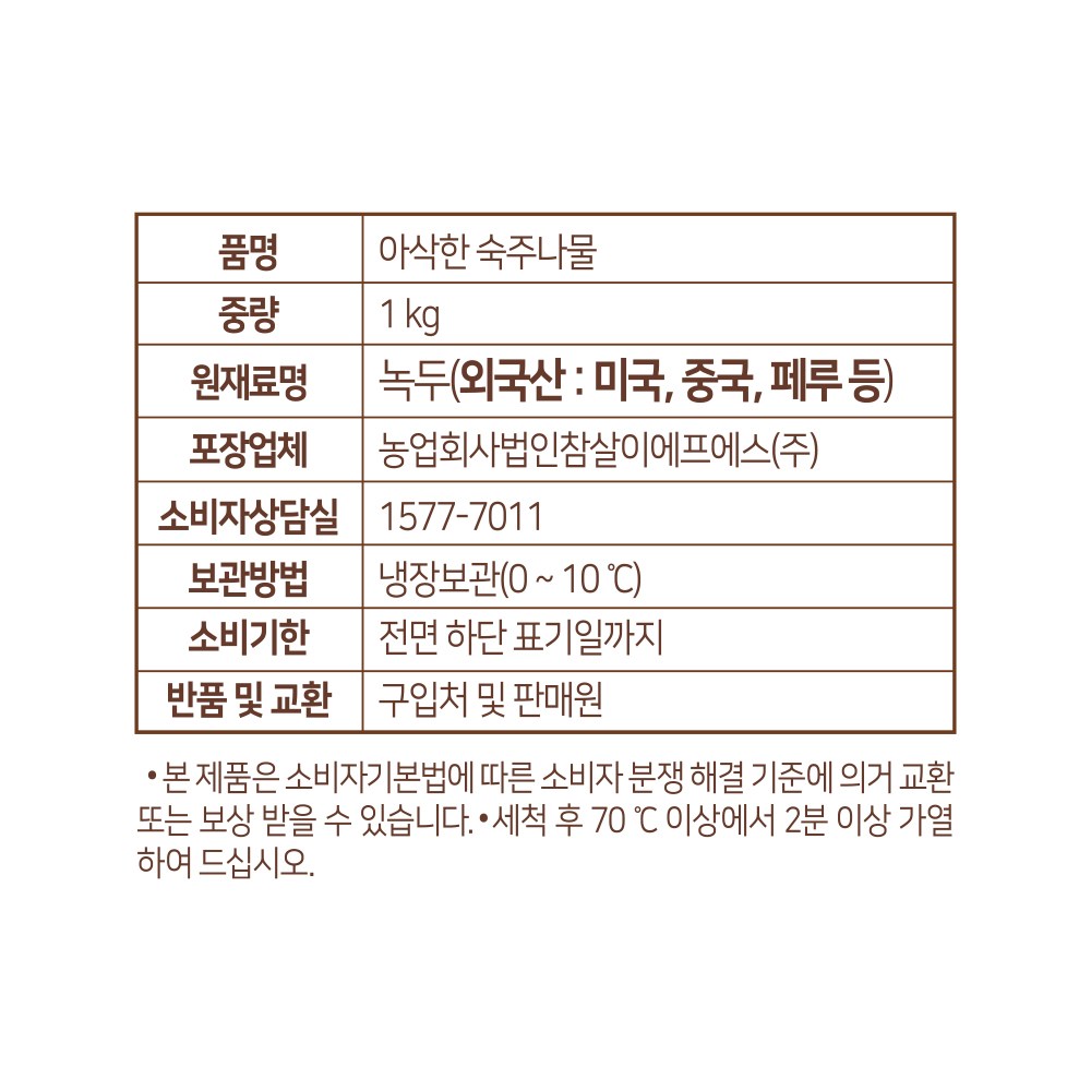 | 품목 또는 명칭 | 곰곰 아삭한 숙주나물 | 포장단위별 내용물의 용량(중량),수량,크기 | 1kg, 1개 |