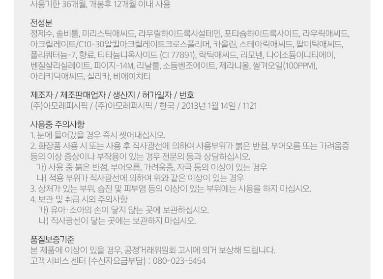 | 화장품제조업자, 화장품책임판매업자 및 맞춤형화장품판매업자 | 아모레퍼시픽 | 제조국 | 상품 상세페이지 참조 |