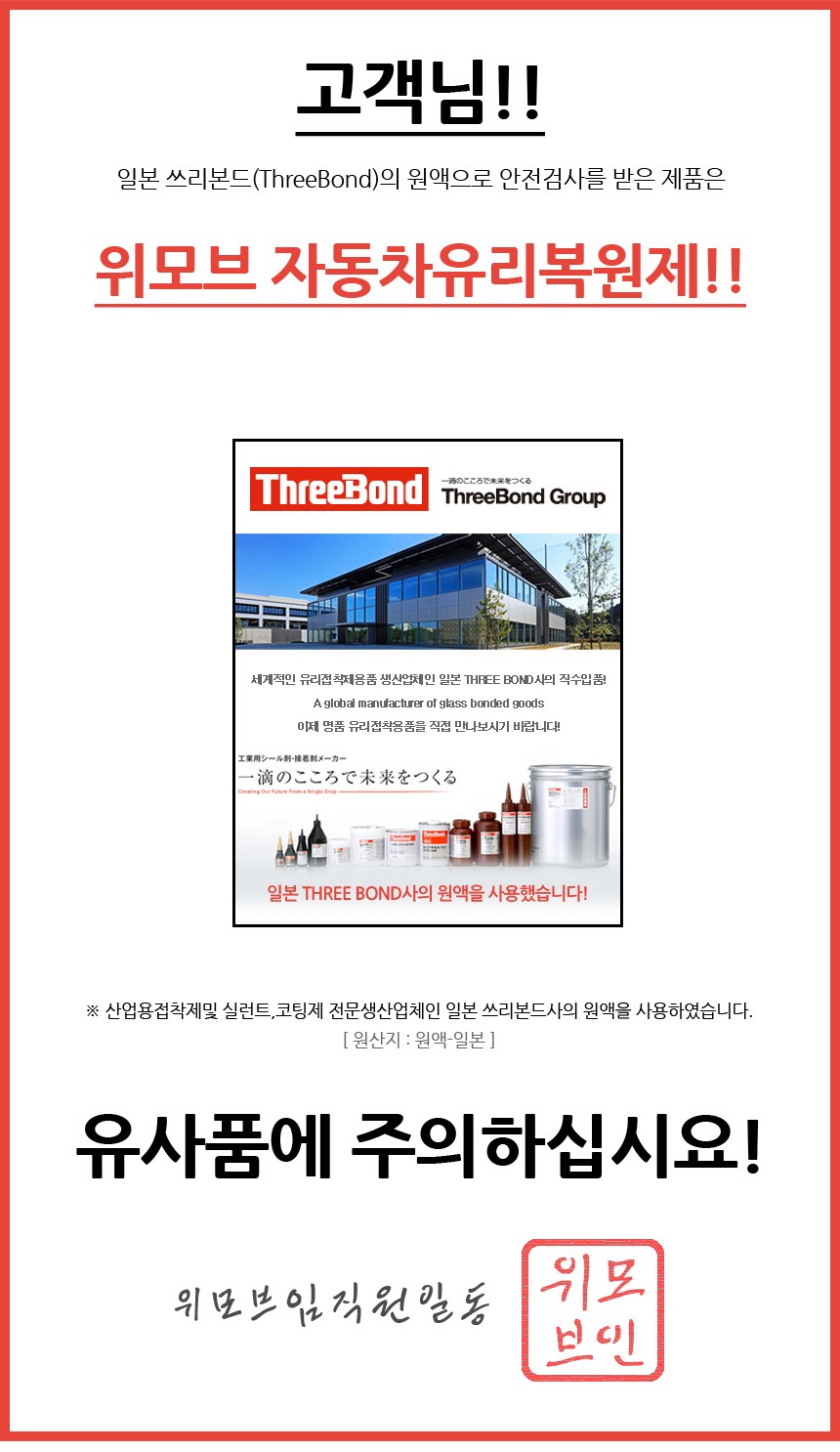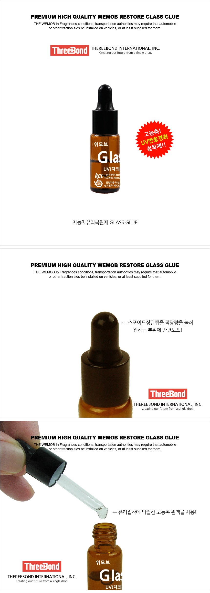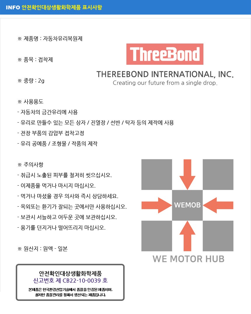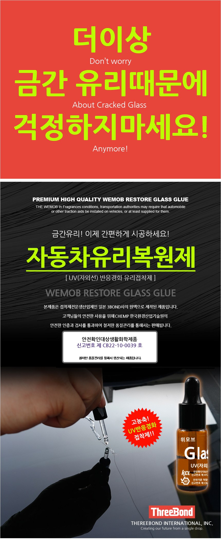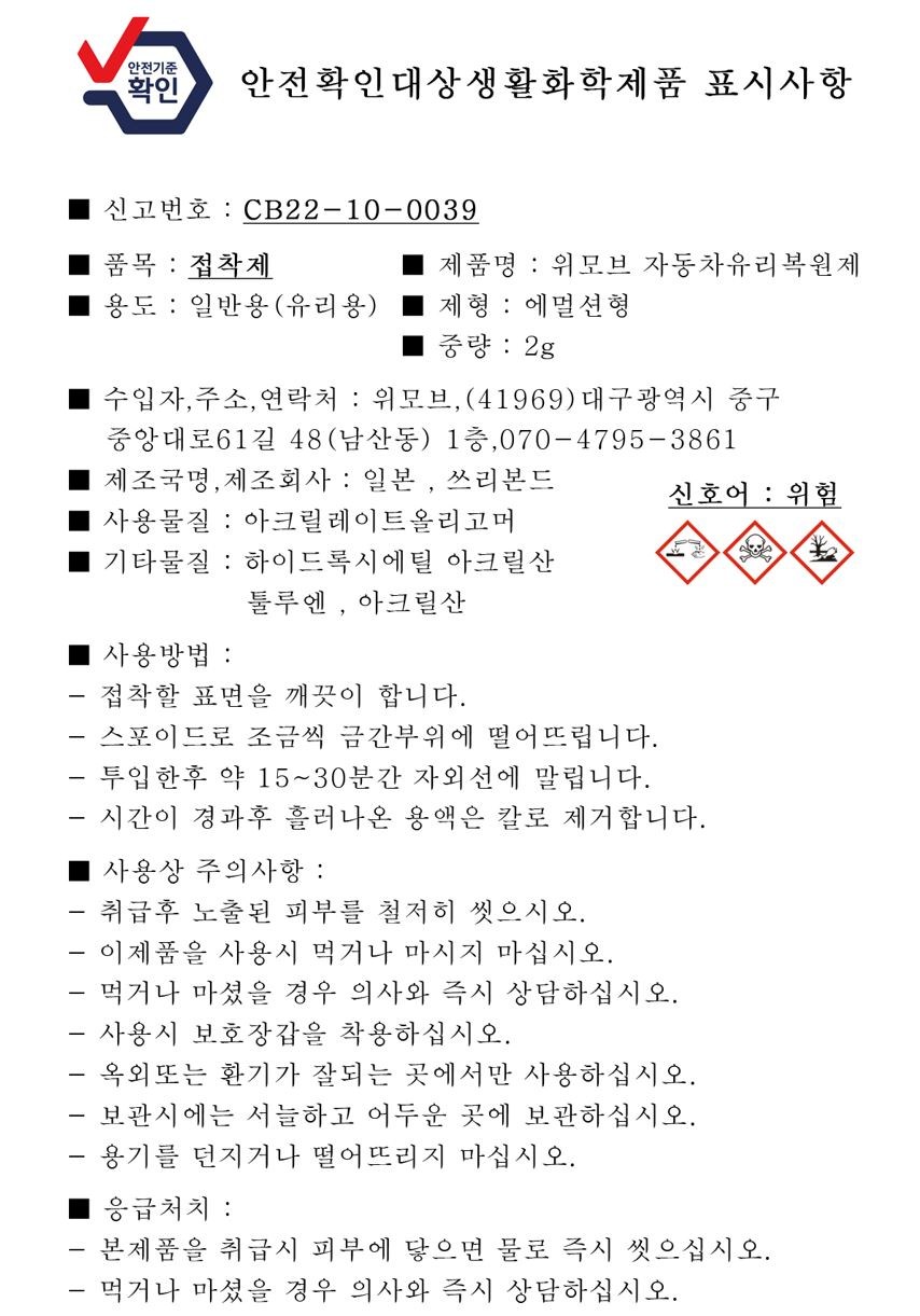 | 품목 및 제품명 | 접착제 / 위모브자동차유리복원제 | 용도(표백제의 경우 계열을 함께표시) 및 제형 | 일반용-유리용 / 비분사형-에멀션형 |