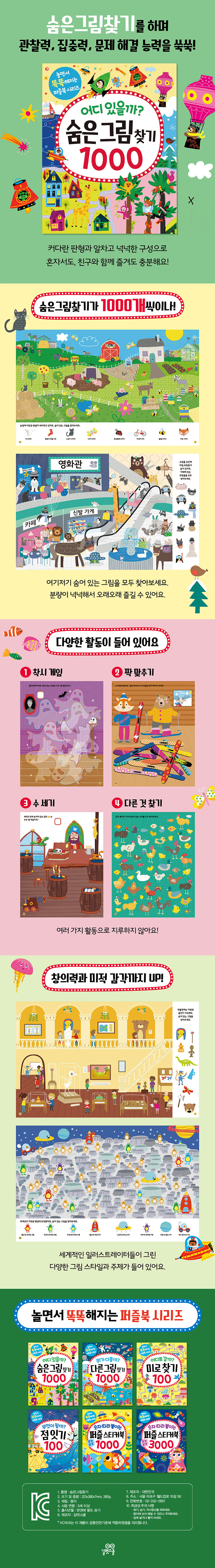 | 품명 및 모델명 | 놀면서 똑똑해지는 퍼즐북 시리즈-어디있을까?숨은그림찾기1000 | KC 인증정보 | 유/KC마크 |