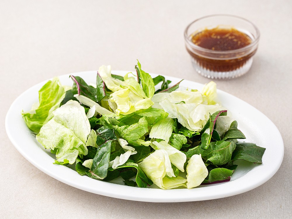 샐러드 채소와 오리엔탈 드레싱으로 구성되어 있습니다.
