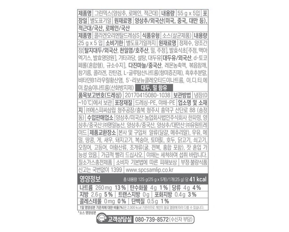 | 소비기한 또는 품질유지기한 | 제조년월일 : 2026년 04월 26일 이후인 제조상품 | 세부 품목군별 표시사항 | [그린믹스] 농수산물 : 유전자변형(해당 없음) / 지리적 표시사항(해당 없음) [콜라겐 오리엔탈드레싱S] 해당 없음 |