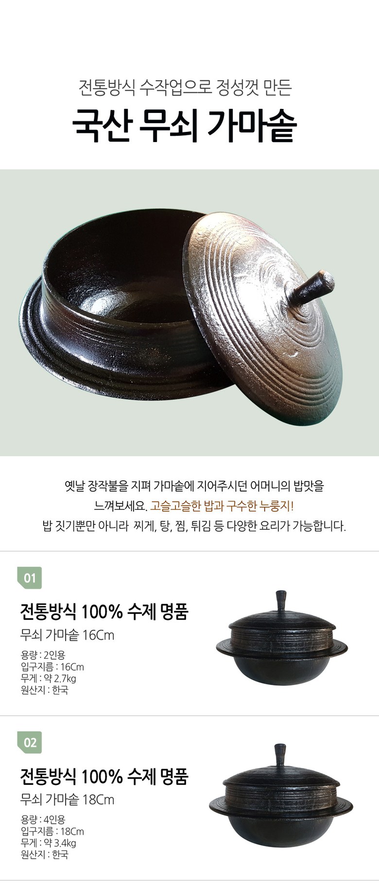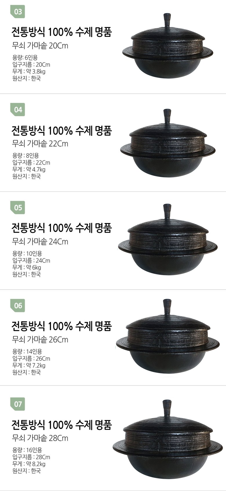 | 구성품 | 무쇠 솥, 무쇠 뚜껑 | 크기 | 16cm, 18cm, 20cm, 22cm, 24cm, 26cm, 28cm |