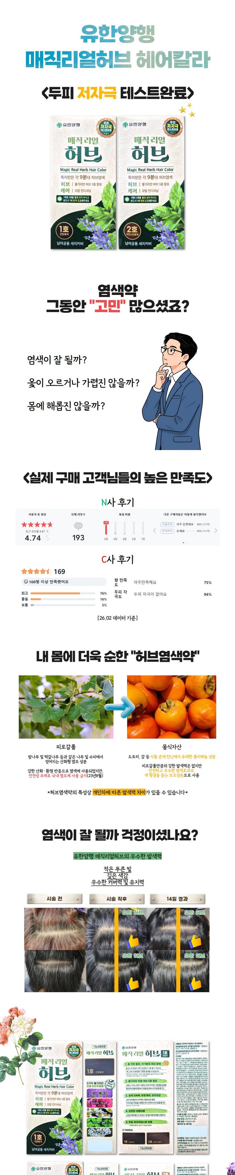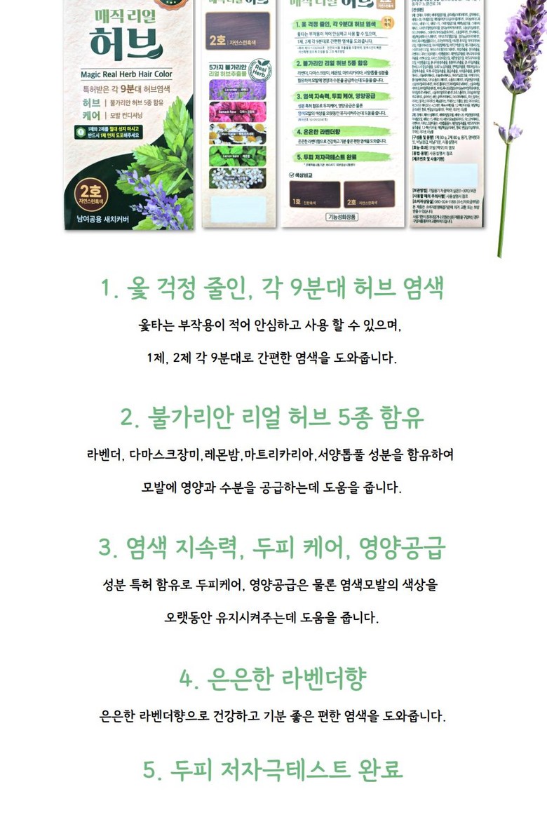 | 용량(중량) | 유한매직리얼허브 1호진한흑색/2호연한흑갈색 | 제품 주요 사양 | 1호진한흑색/2호연한흑갈색 |