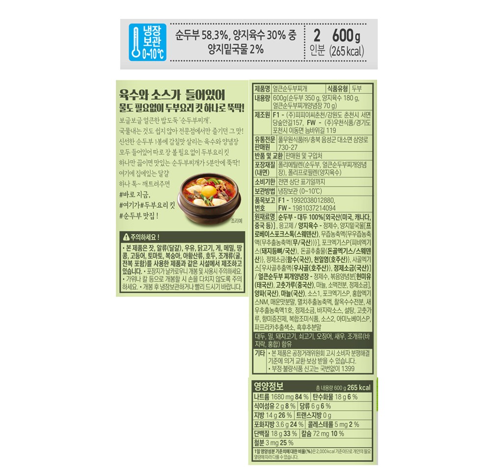 | 제품명 | 얼큰순두부찌개 | 식품의 유형 | 컨텐츠 참조 |