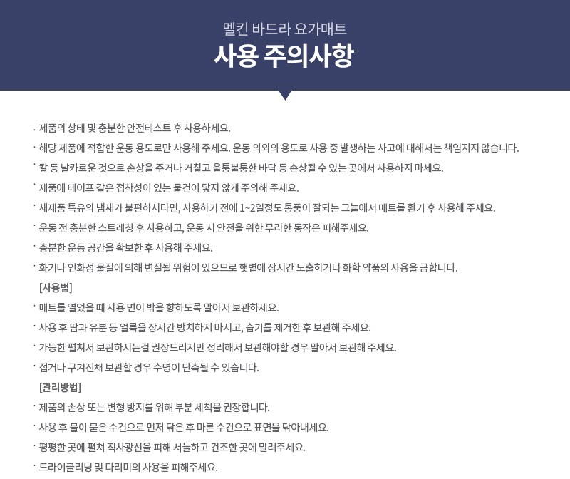 | 품명 및 모델명 | 멜킨 TPE 5mm 프리미엄 바드라 요가매트 | KC 인증정보 | 해당없음 |