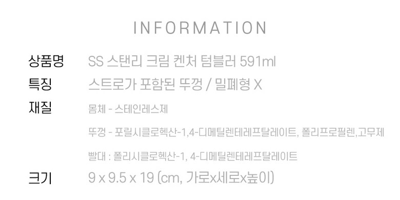 | 품명 및 모델명 | 품명:텀블러 / 모델명:[스타벅스] SS 스탠리 크림 켄처 텀블러 591ml | 재질 | 몸체 - 스텐인레스제 / 뚜껑 - 폴리시클로헥산-1, 4-디메틸렌테레프탈레이트, 폴리프로필렌, 고무제 |