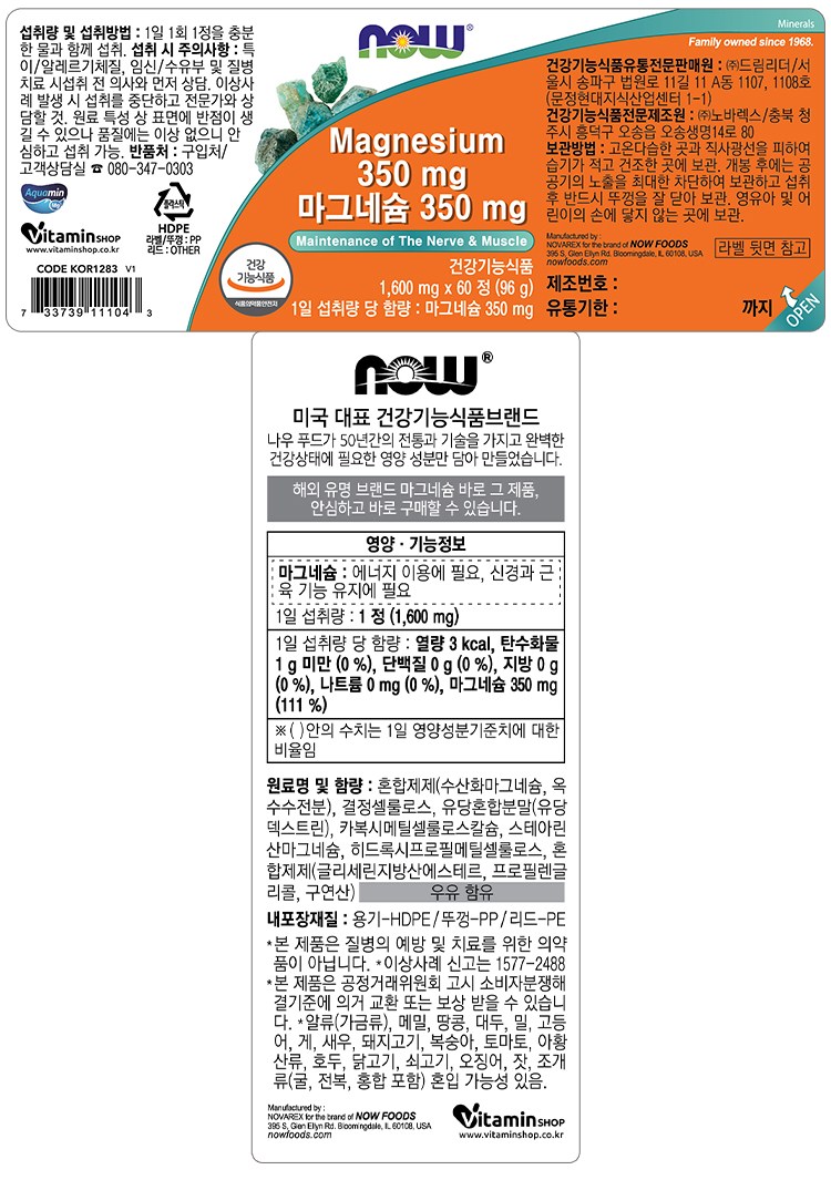 | 제품명 | 마그네슘 350mg | 제조업소의 명칭과 소재지 | 컨텐츠 참조 |