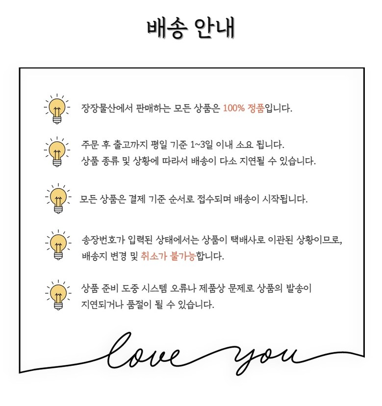 | 배송기간 | ㆍ도서산간 지역 등은 배송에 3-5일이 더 소요될 수 있습니다. - 천재지변, 물량 수급 변동 등 예외적인 사유 발생 시, 다소 지연될 수 있는 점 양해 부탁드립니다. | ||