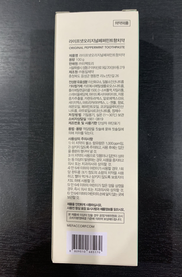 | 품명 및 모델명 | 라이프넷 오리지널 페퍼민트향 치약 | 인증/허가 사항 | 의약외품 |