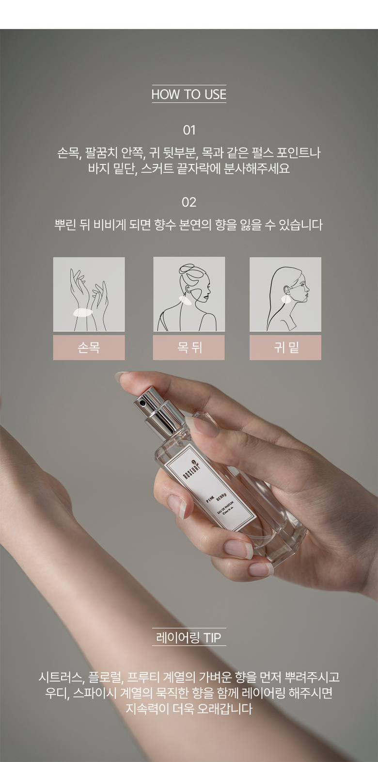 | 사용기한 또는 개봉 후 사용기간 | 제품 별도 표기 | 사용방법 | 손목, 팔꿈치 안쪽, 귀 뒷부분, 목 부분 등 맥박이 뛰는 곳에 분사하여 사용합니다. |