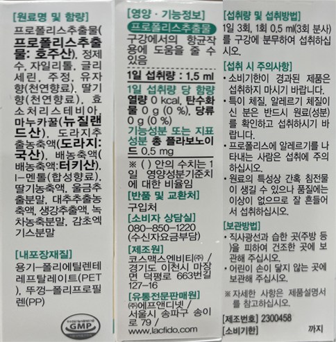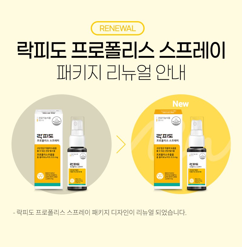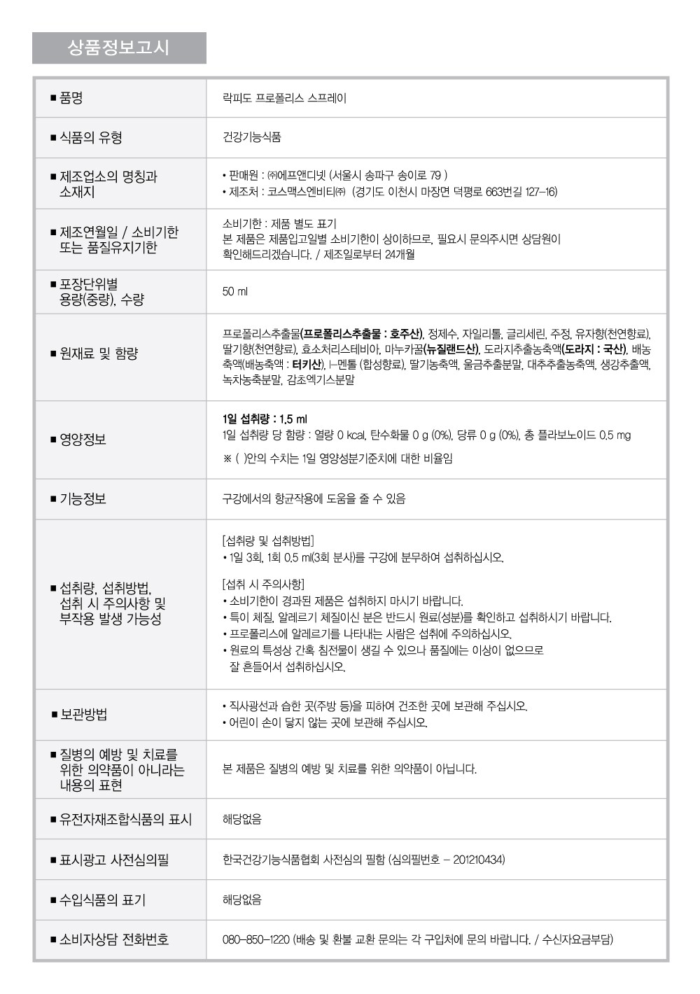 | 제품명 | 락피도 프로폴리스 스프레이 | 제조업소의 명칭과 소재지 | 컨텐츠 참조 |
